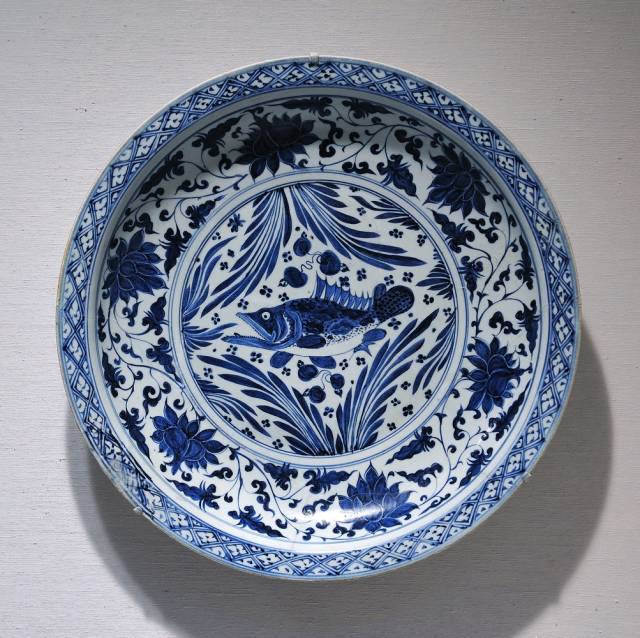 大都会博物馆收藏的这件元代青花瓷盘,按陶瓷学者的定名习惯,应叫“元青花鱼藻纹折沿瓷盘”。盘体很大,盘壁缓弧,折沿圆口,形体优美,质地细腻,保存完好。盘内壁通体饰白地青花,内外共三层,盘腹两层,折沿一层,以弦纹间隔。盘中央主题纹样为鱼藻纹,浮萍之下水草中间,一条体态肥腴的鳜鱼(也称桂鱼)正在畅游,张口摆尾,背脊刺骨高耸,显示出这是一条健壮的南方名贵淡水鱼。