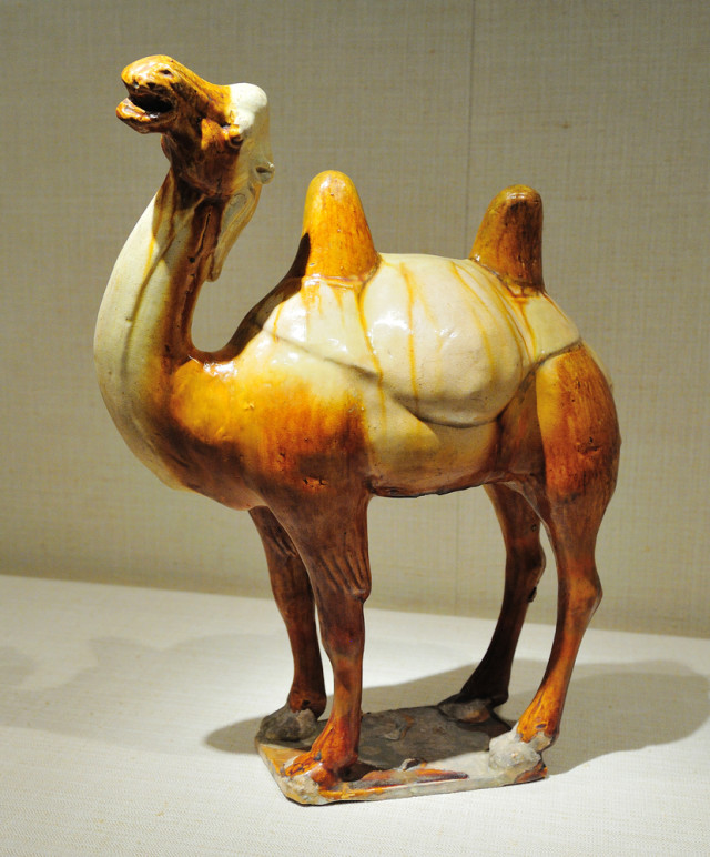 唐三彩制品在第七世纪末和八世纪上半叶被广泛用于陪葬品。此壶的形状源于古代伊朗的金属制品,表明了丝绸之路对贸易和艺术的影响。