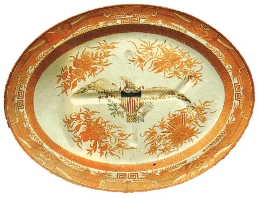 第五阶段是晚清民国,这时期贸易陶瓷开始衰落。广彩在这一时期具有较大影响力,行销世界,也不乏精品,其中菲茨休纹饰瓷器是代表之一,主要销往美国,质量高于其他外销瓷。一般表现为中心大徽章,周围四个分隔,边饰菱形、花卉、蝴蝶、方格等纹饰。
