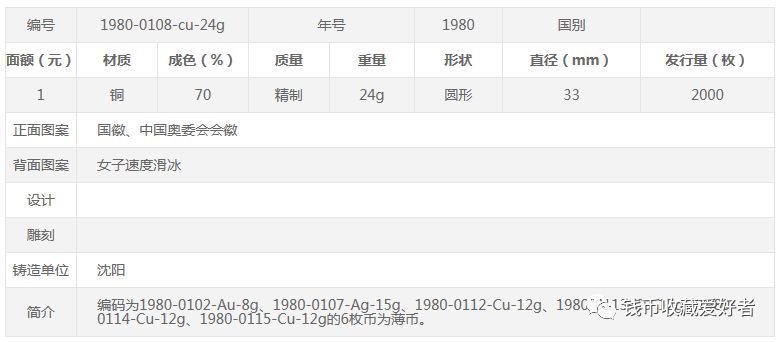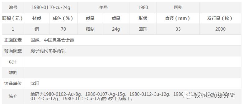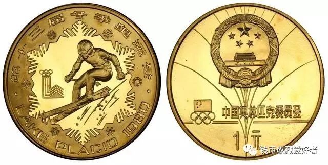 1980年发行了第十三届冬奥会铜质纪念币4枚,单枚重24克、发行量2000枚,1980年的年初发行,与盐湖城冬奥会金银纪念币配套,面值1元。分为普通版和加厚版。这套纪念币的设计简洁大方、具有很大灵动性和张力感。
