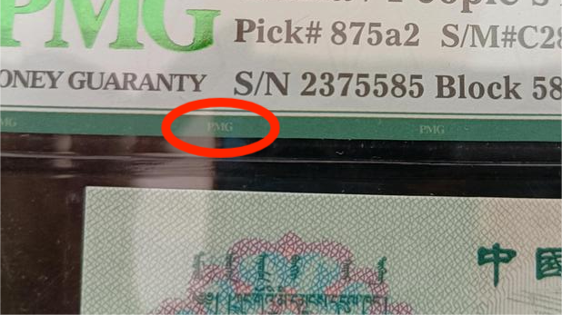 其次,网友收到的货后,去PMG官网上查了下,发现他收到的封装壳和官网上的图不一样,标签的绿条处多了PMG字样。