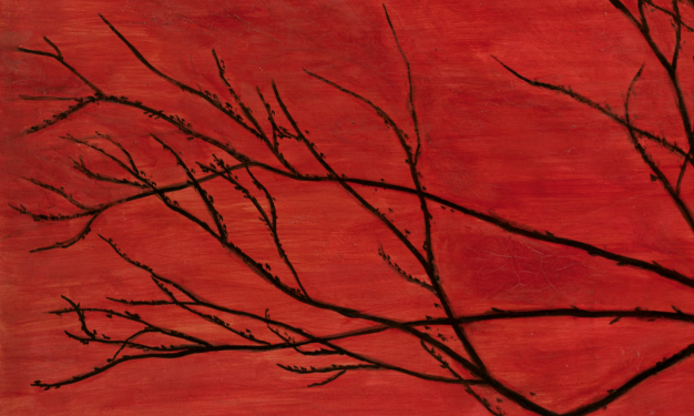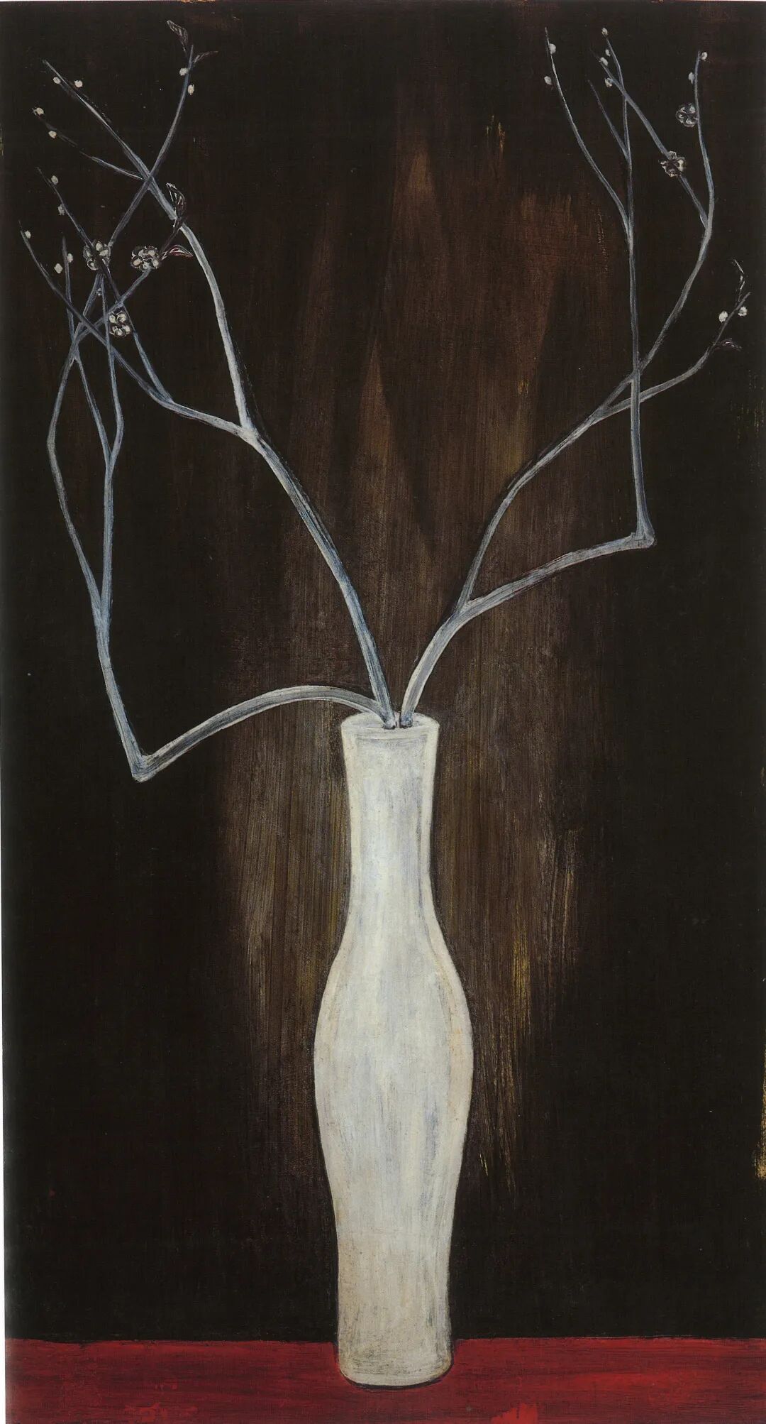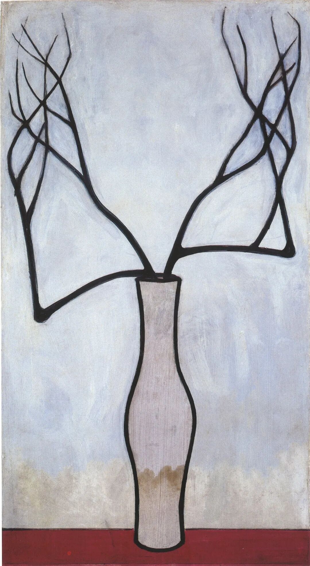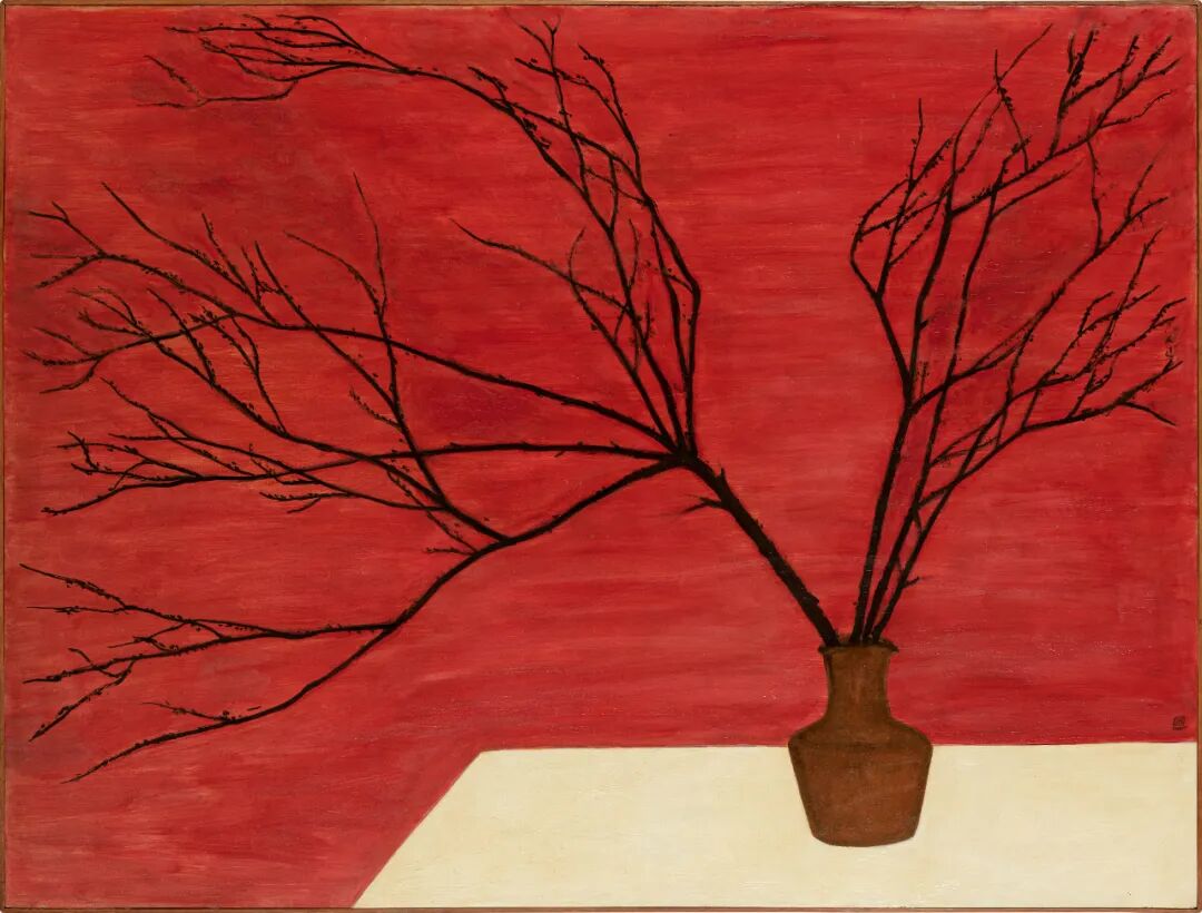 花卉是常玉毕生创作不辍之主题,种类千姿百态,当中不乏传统国画中经典的梅兰菊竹,若论花卉之形态,本幅《红底瓶枝》可与常玉《枯梅》及两幅《腊梅》并观,当中《枯梅》与两幅《腊梅》的鹿角形梅枝构图基本一致,而《枯梅》与《腊梅》又已进入台湾历史博物馆永久馆藏,而另一幅《腊梅》则与本幅《红底瓶枝》成为仅见于私人手上的常玉珍品。《红底瓶枝》是四幅作品之中尺幅最恢宏之巨作,其构图在艺术家芸芸花绘之中亦允称唯一。