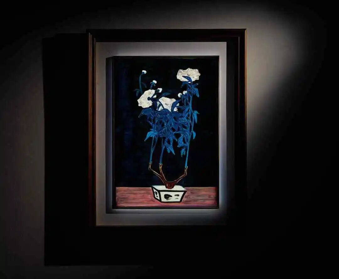 本画采用呼应南宋山水「一边半角」之美学概念,将瓶花置诸右侧,并刻意露出餐桌边角,营造层层递进的透视感;而瓶花放诸案头,在中国传统象征符号学中谐音「平安」,画面散发岁岁吉祥的祝福意味。《红底瓶枝》虽然综合花瓶、红墙、桌案及花卉四种具象元素,构图却寸寸鼓励着观者的联想引伸至框外之境,并呼应着中式美学的抽象与意识形态,是为常玉画作超越表象的艺术深度。于此,常玉和谐地糅合东方传统魅力与西方现代艺术,造就了永恒幽美的一幕绝色盆景。![]()