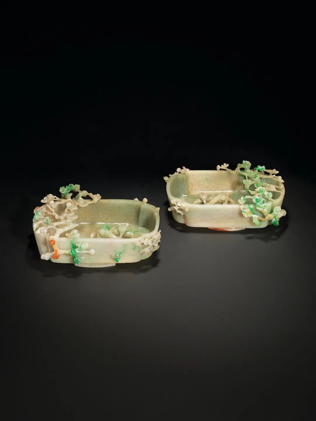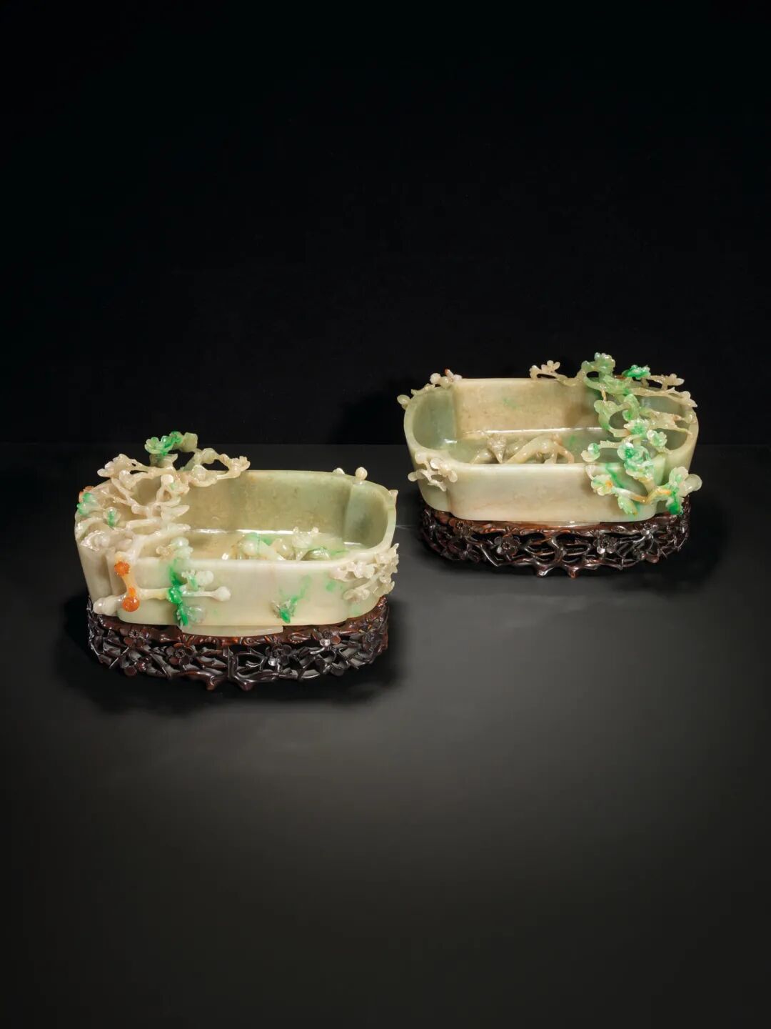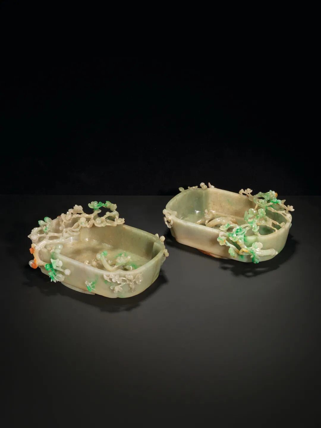 清十九世纪 翠玉镂雕螭龙梅花洗纹一对 成交价937500港元