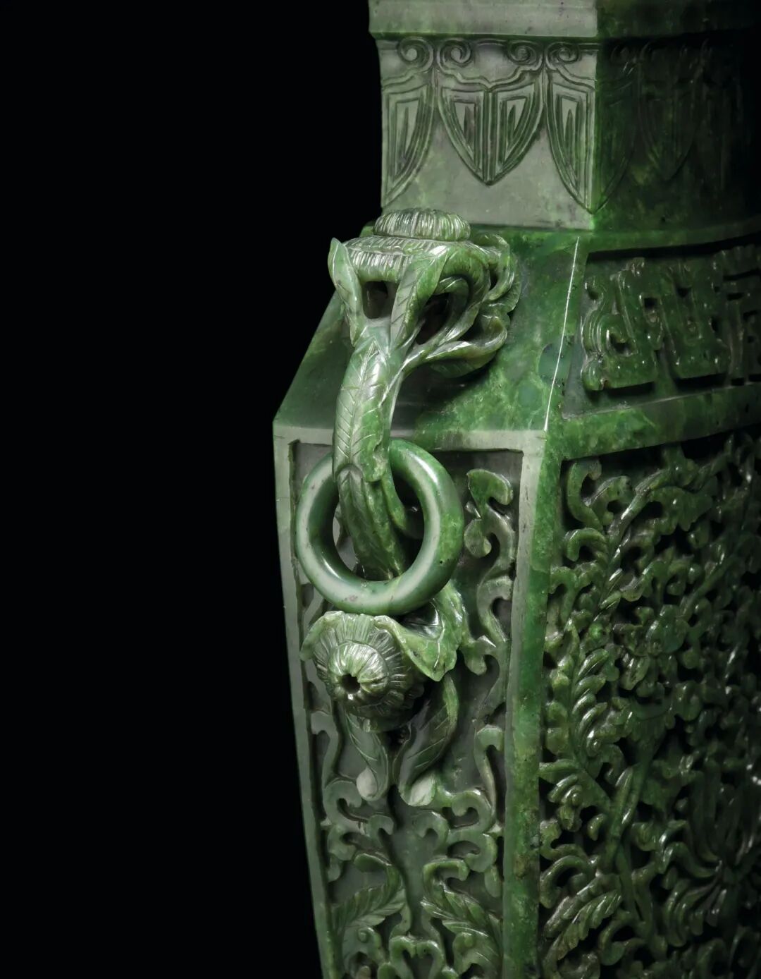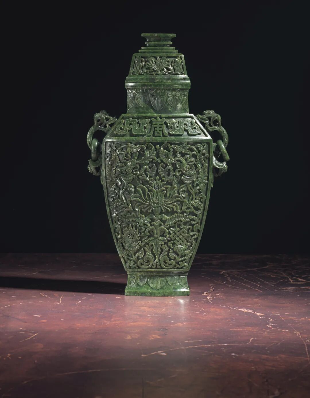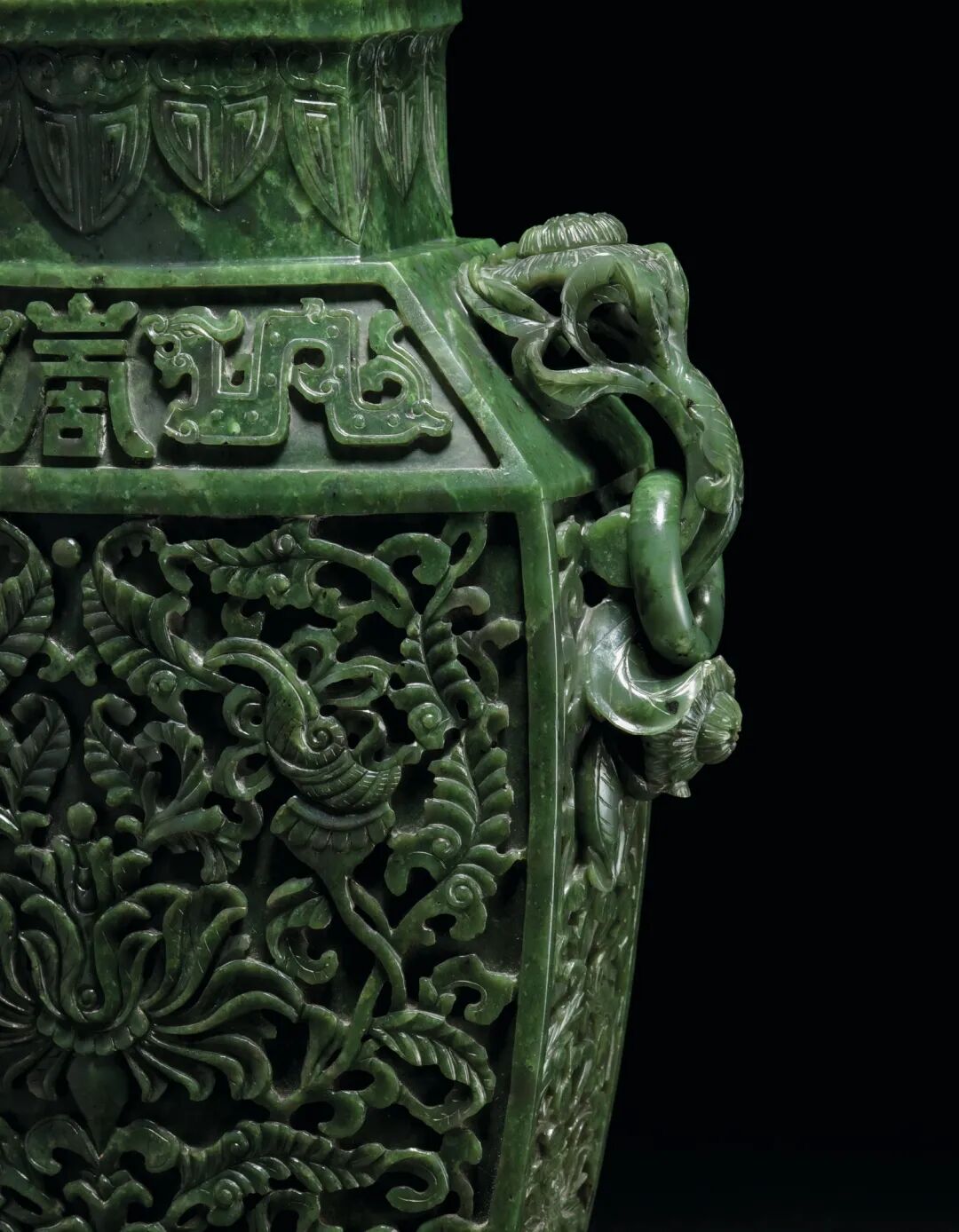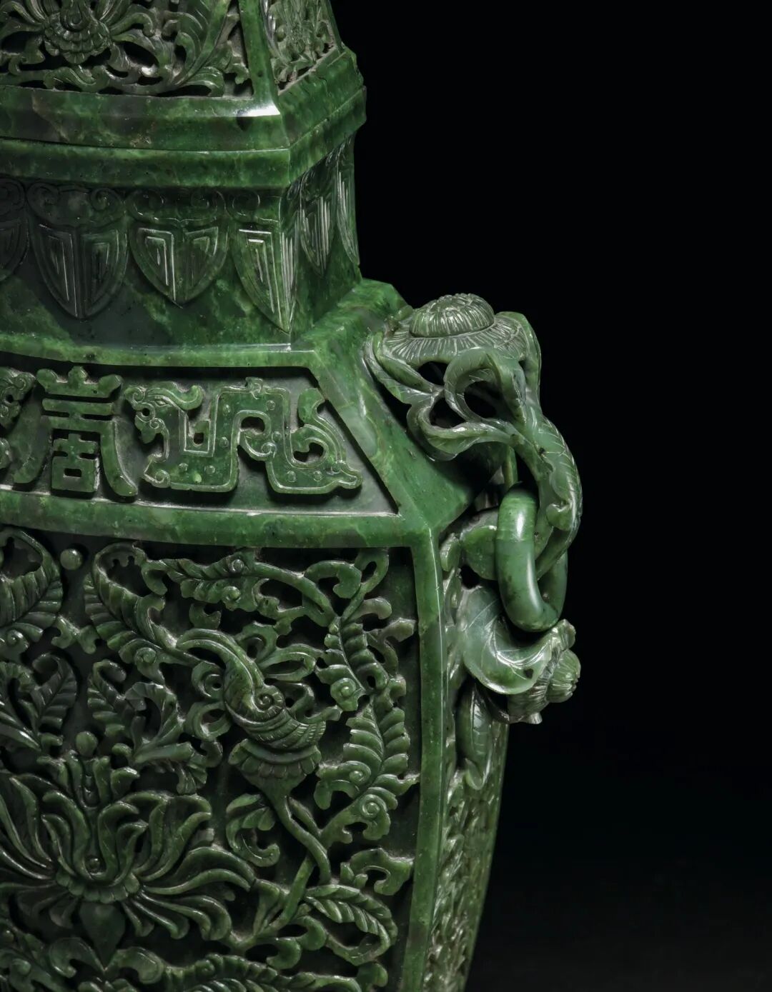 清十八世纪 碧玉莲托八吉祥纹双菊耳大盖瓶 估价100万-200万港元
