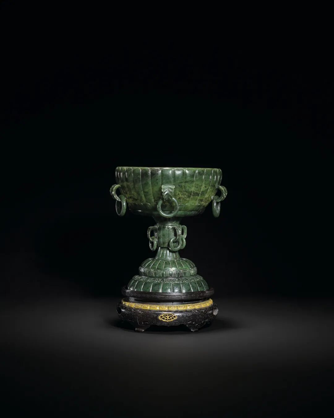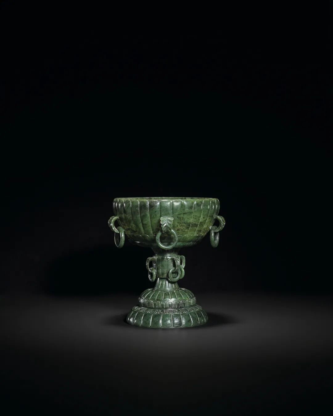 清十九世纪 碧玉菊花活环耳高足碗 成交价300000港元