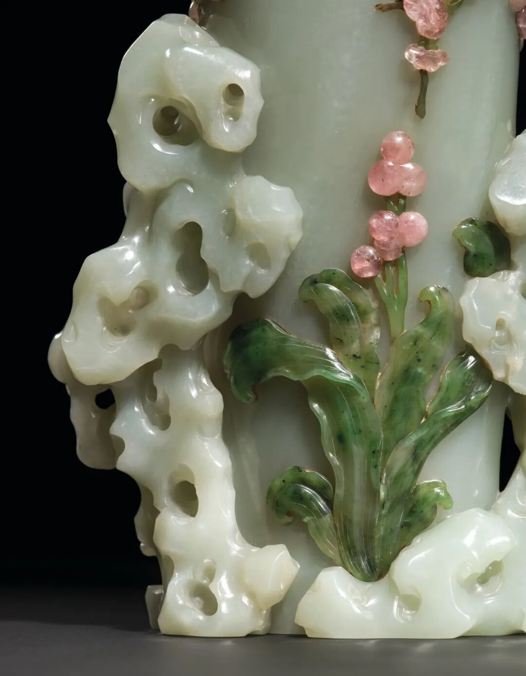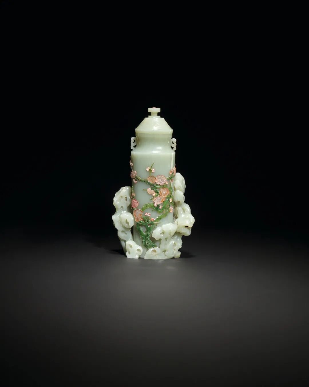 清十八世纪 青白玉嵌碧玉碧玺梅花万年青纹盖瓶 成交价3000000港元