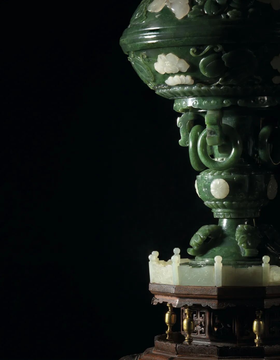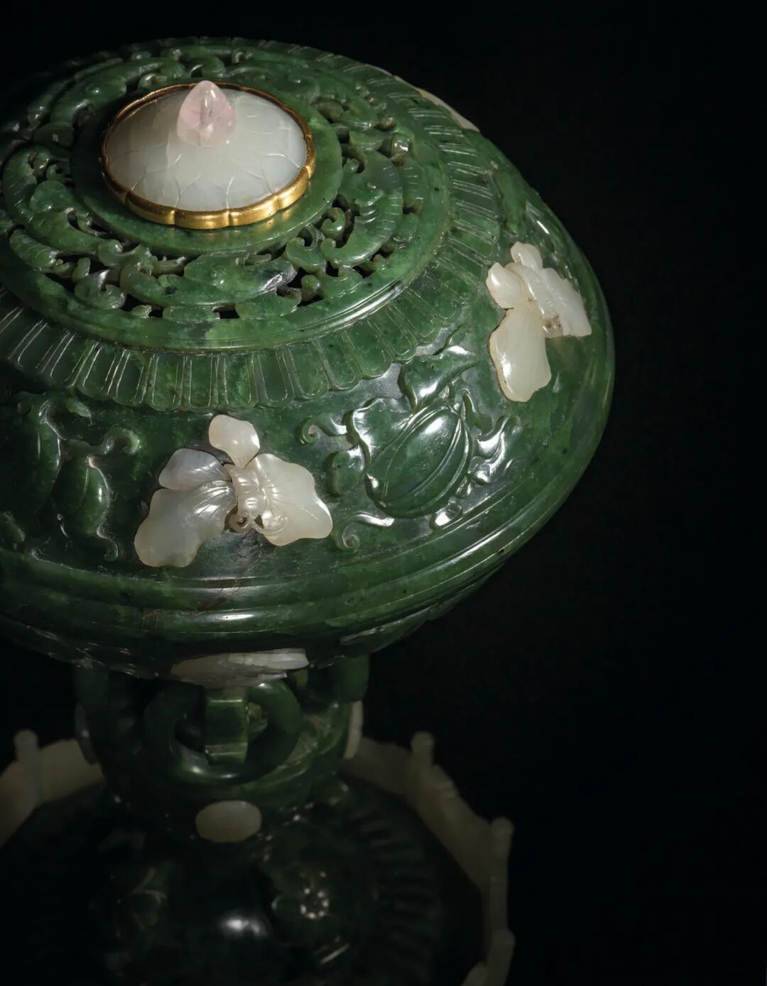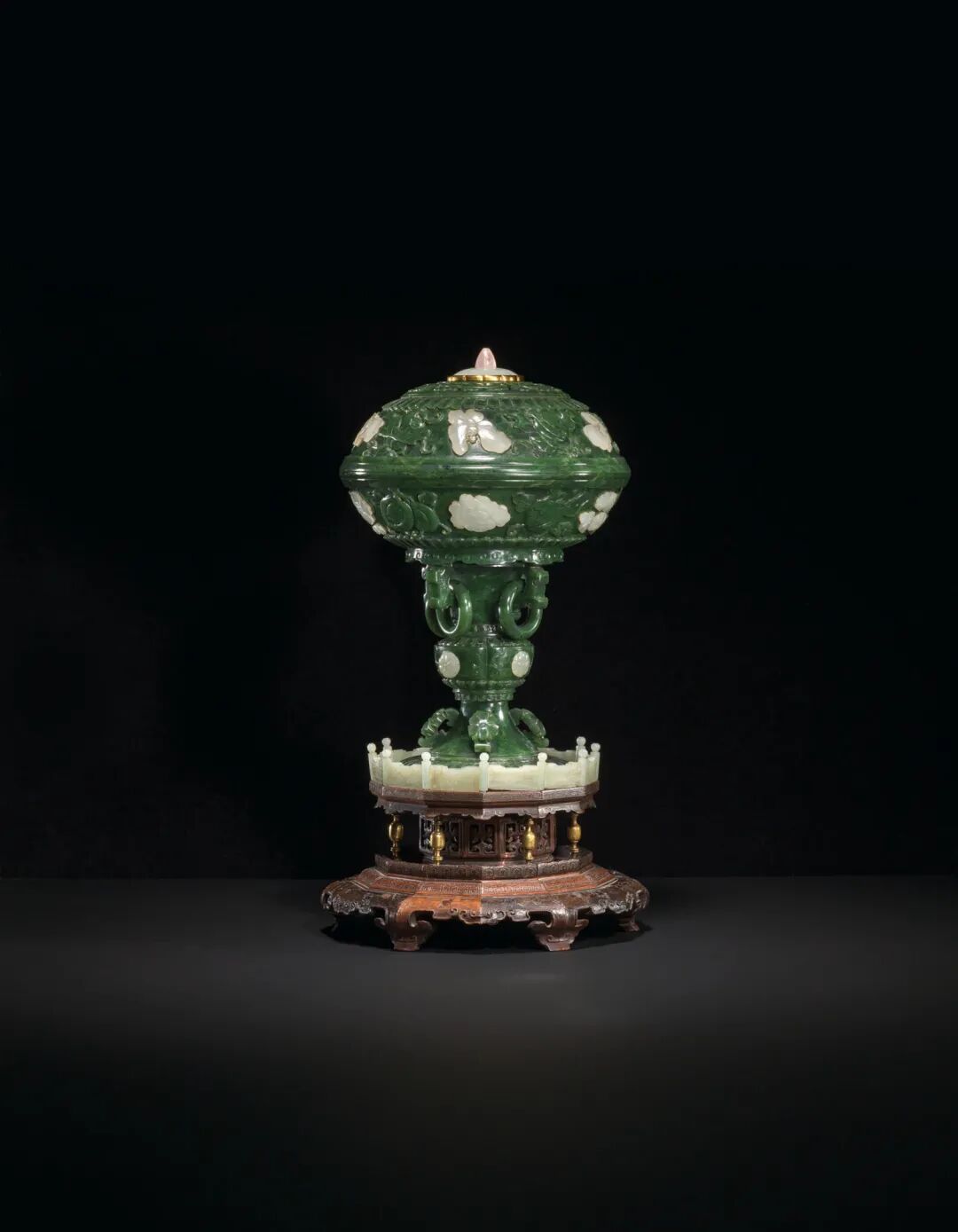 清十八世纪 碧玉嵌白玉花蝶纹高足盖碗 成交价1000000港元