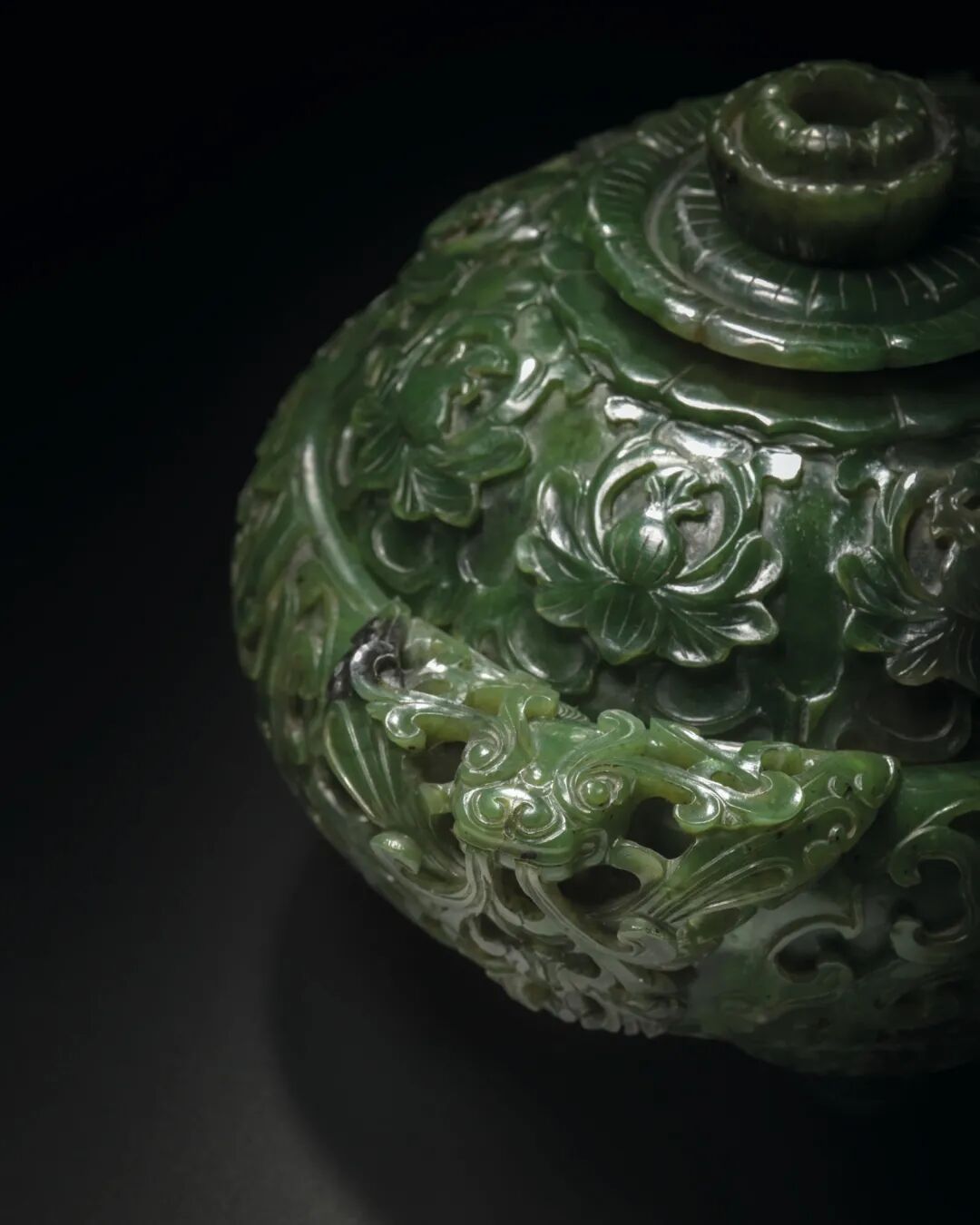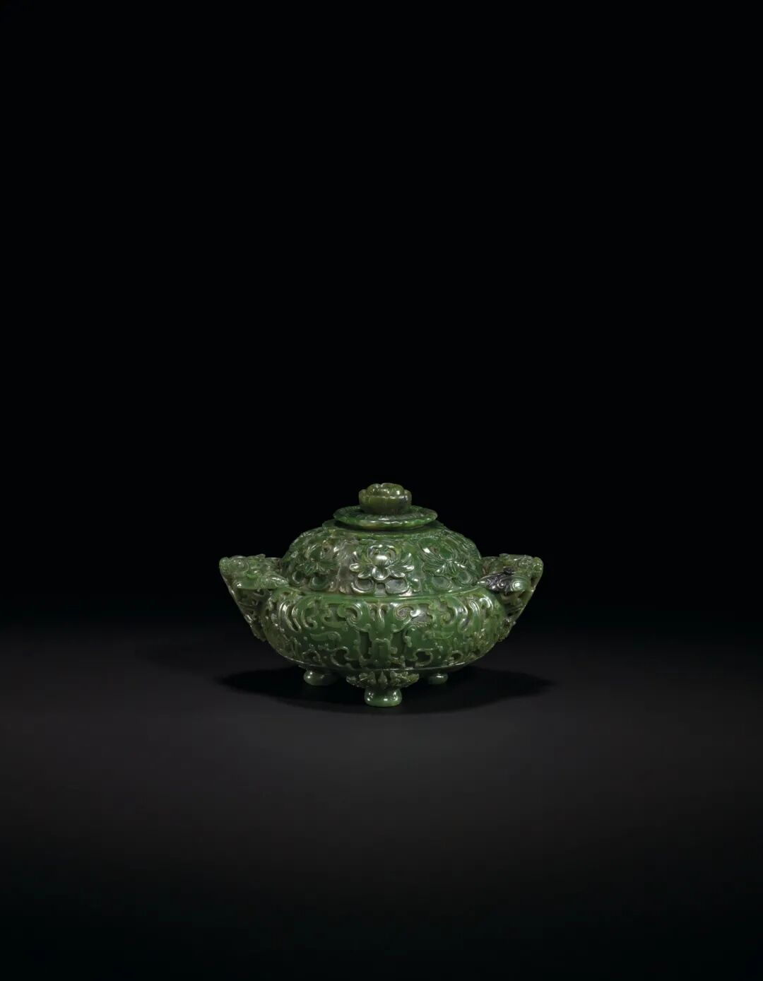 清十八-十九世纪 碧玉饕餮纹双兽耳三足盖炉 成交价275000港元