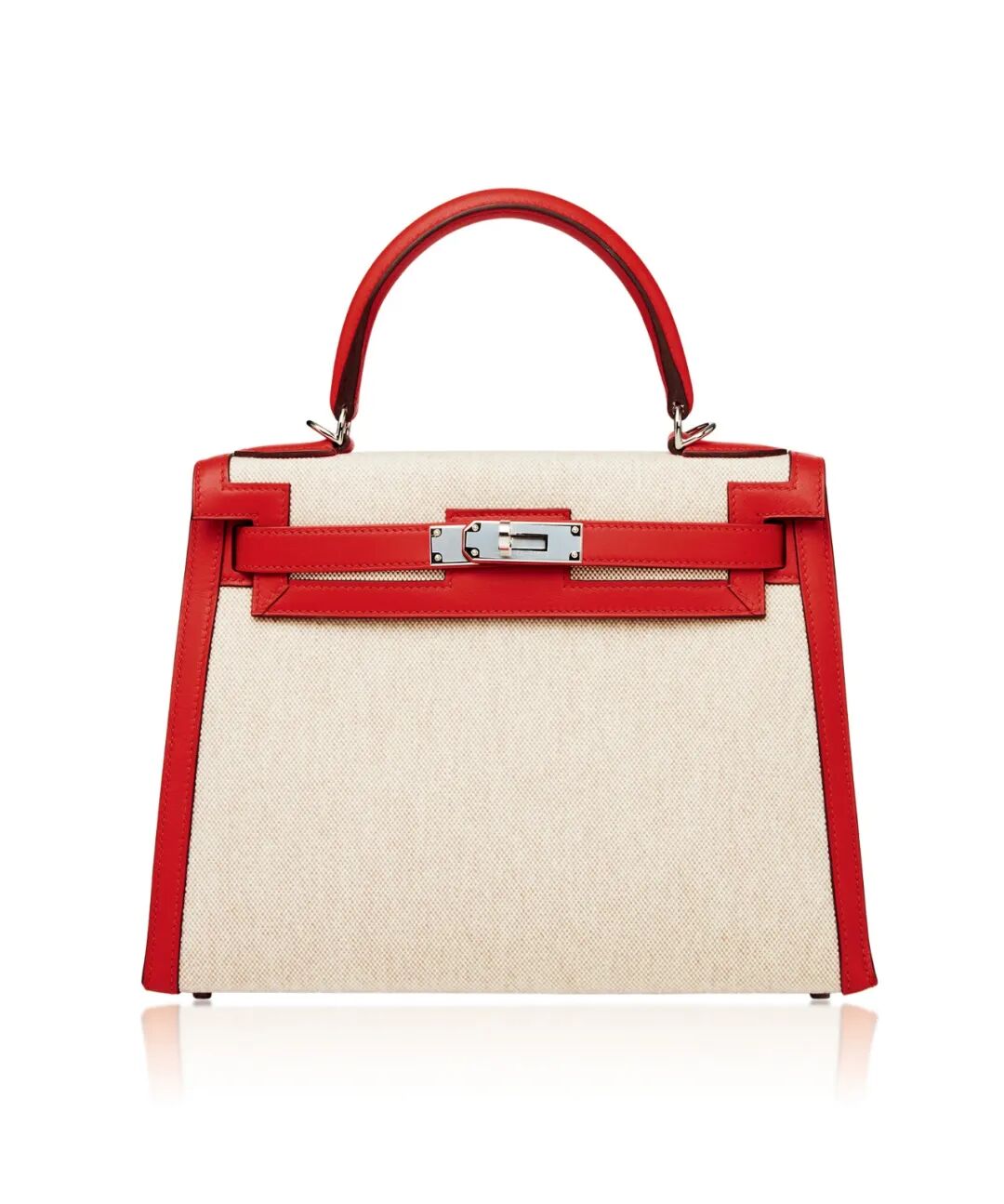 爱马仕 心跳红色SWIFT牛皮拼帆布28公分凯莉包附银色金属配件