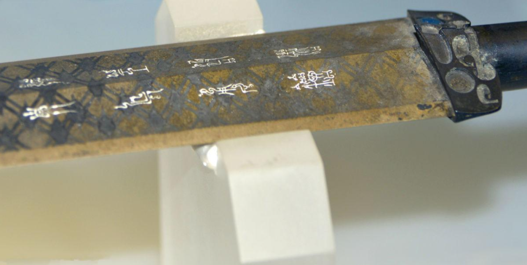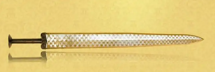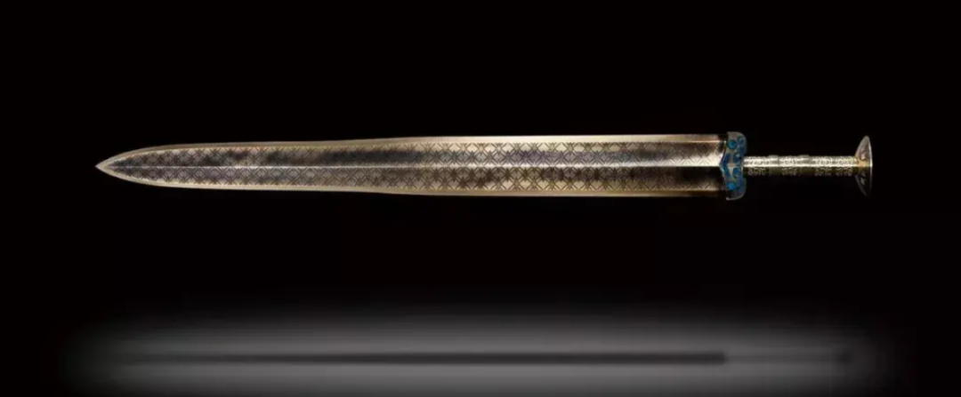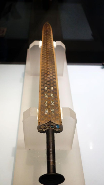 春秋越王勾践剑长55.7厘米,柄长8.4厘米,剑宽 4.6厘米,剑首外翻卷成圆箍形,内铸有间隔只有0.2毫米的11道同心圆,剑身上布满了规则的黑色菱形暗格花纹,正面近格处有“越王鸠(勾)浅(践)自作用剑”的鸟篆铭文,剑格正面镶有蓝色琉璃,背面镶有绿松石。