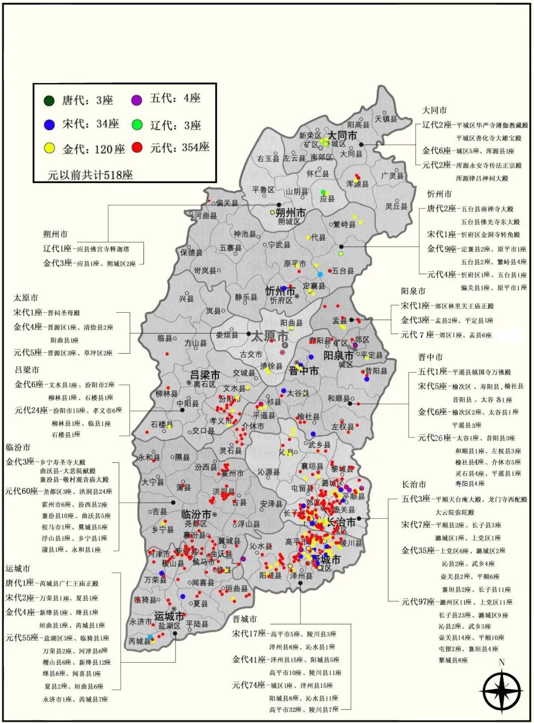 山西省唐至元木构建筑分布统计图