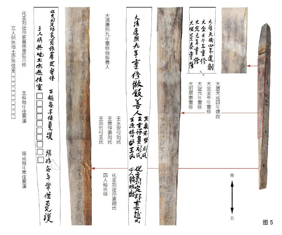 刻于大雄宝殿东北角柱北侧,金大定九年(1169 年)四月题。题记4行,自左向右行文,楷书,刻工较好。题字者为时任黎城县令李晏,字致美,号游仙野人,泽州高平人,是金世宗大定朝的士林领袖和经学权威,《金史》有传。