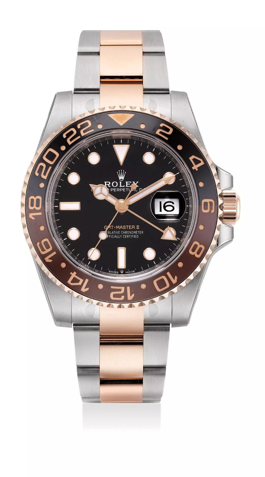 劳力士,“GMT –Master II Rootbeer”型号126711CHNR,18K玫瑰金及精钢自动上弦链带腕表,配中心秒针、日期显示和陶瓷表圈,约2018年制。附保证书、表盒和配件