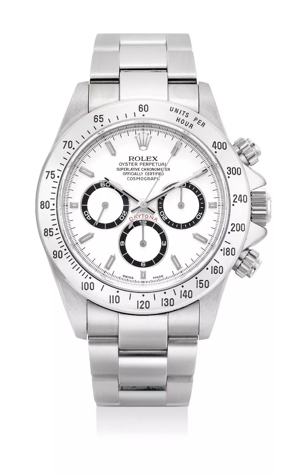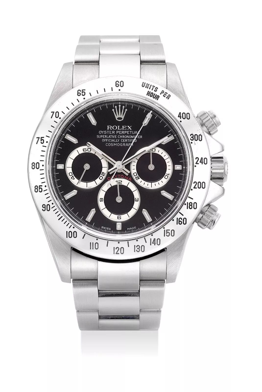 (左图)劳力士,“Cosmograph Daytona”型号16520,精钢自动上弦链带腕表,配计时功能和中心秒针,约1999年制。附原装表盒、保证卡、配件