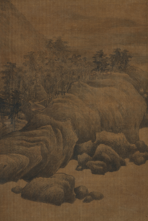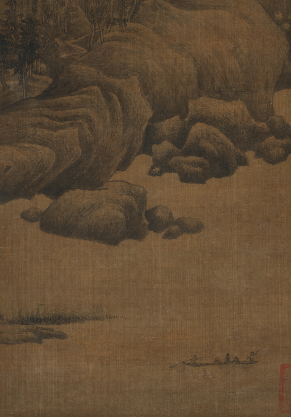 本幅的构图非常奇突,它不以巨峰层峦作主题,只取高山脚下起伏的冈坡为主景,重迭推移,石面极为险滑,似无可立足之地,只有沿着林间小路,方可蜿曲前行。光滑的山石都用小笔细皴写出,只在阴暗处重复皴勾,画面简洁精致,比较接近《层岩丛树图》的清朗。但《层岩丛树图》的山顶多用重迭的矾头,构图亦基本上保留着前景中景的布局。此幅《山川归渡图》则只把重心凝聚于团团巨石,石上不落一笔苔点,只用强烈的明暗对比来突出山石的质感,整体显得厚重端凝,如此独特的画面,令人一见难忘。米芾《画史》云:「巨然少年时多作矾头,老年平淡趣高」,则这幅《山川归渡图》是否是他较晚期的作品,值得更深入地研究。