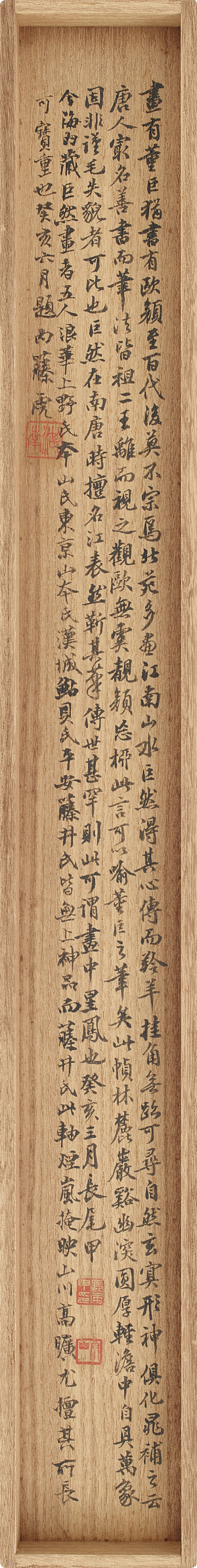 (内藤湖南)今海内藏巨然画者五人,浪华上野氏、本山氏、东京山本氏、汉城鲇贝氏、平安藤井氏皆无上神品。而藤井氏此轴烟岚掩映,山川高旷,尤擅其所长,可宝重也。癸亥(1923)六月题,内藤虎。