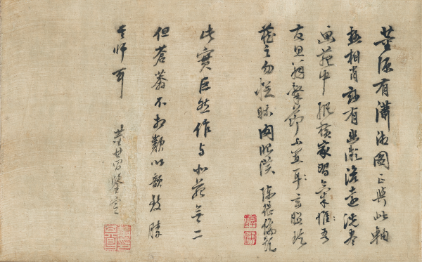 题诗堂:(陈继儒)董源有潇湘图,正与此图极相肖,妙有幽微淡远,洗尽画苑中纵横家习气,吾友思翁击节不置。玄照珍藏之,勿轻视肉眼仆。陈继儒题。钤印:醇、儒(连珠印)(董其昌)此实巨然作,与北苑无二,但苍蓊不相类,以韵致胜其师耳。董其昌鉴定。钤印:董其昌印