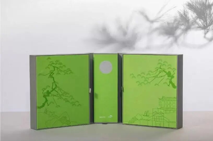 选取文物画面中的圆月、云彩、松树以及童子手中所执的葫芦,以淡雅的色彩,在月饼之上呈现宋代美学意境。礼盒仿古书形式打开,一抹新绿勾勒苍劲松影,松下两幅场景——一侧是古人于山间樽前月下,一侧是今人在苏博阖家赏月。