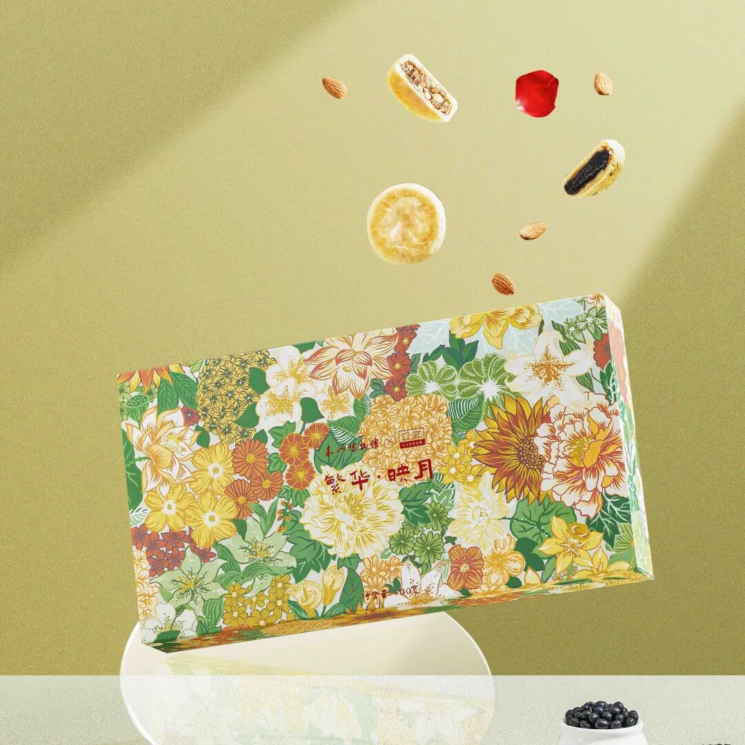 【花好月圆】月饼礼盒以广东省博物馆经典藏品 “石青缎地‘宝生昌’号广绣花鸟大挂帐”中的花鸟纹样为主元素进行设计,寓意繁花似锦,加入明月呼应中秋文化,华美的配色与精美的纹样蕴藏广绣文化。