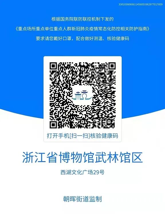 为进一步加强疫情防控工作,浙江省博物馆根据《文化和旅游部办公厅关于进一步做好文化和旅游行业疫情防控工作的紧急通知》(文旅发电〔2021〕195号)、《浙江省文化和旅游厅关于进一步加强文化和旅游室内场所疫情防控工作的紧急通知》要求,为降低当前疫情传播风险,保障观众身体健康,浙江省博物馆实行提前预约、错峰、限流参观措施。武林馆区应属地朝晖街道防疫要求除预约外入馆方式有所改变,我馆其他所有防控措施和观众预约进馆方式不变,即: