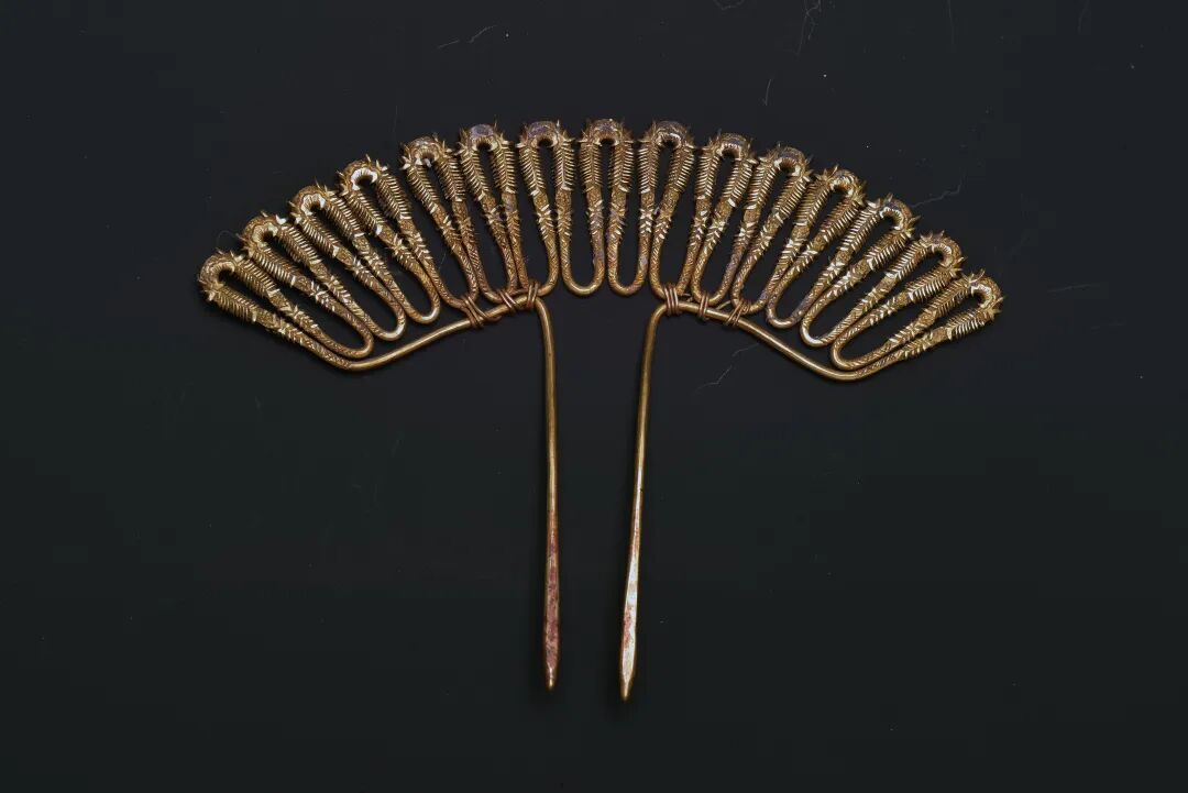 金钗为双股,用一根粗金丝条连续弯曲成十五支花头,部分花头与钗梁用金丝绑结固定。钗头錾刻竹叶纹,刻画精细,似因风吹而外翻的片片竹叶,整器形象丰美,形如孔雀开屏,展现出宋式钗特有的立体灵动与细节刻画的统一。