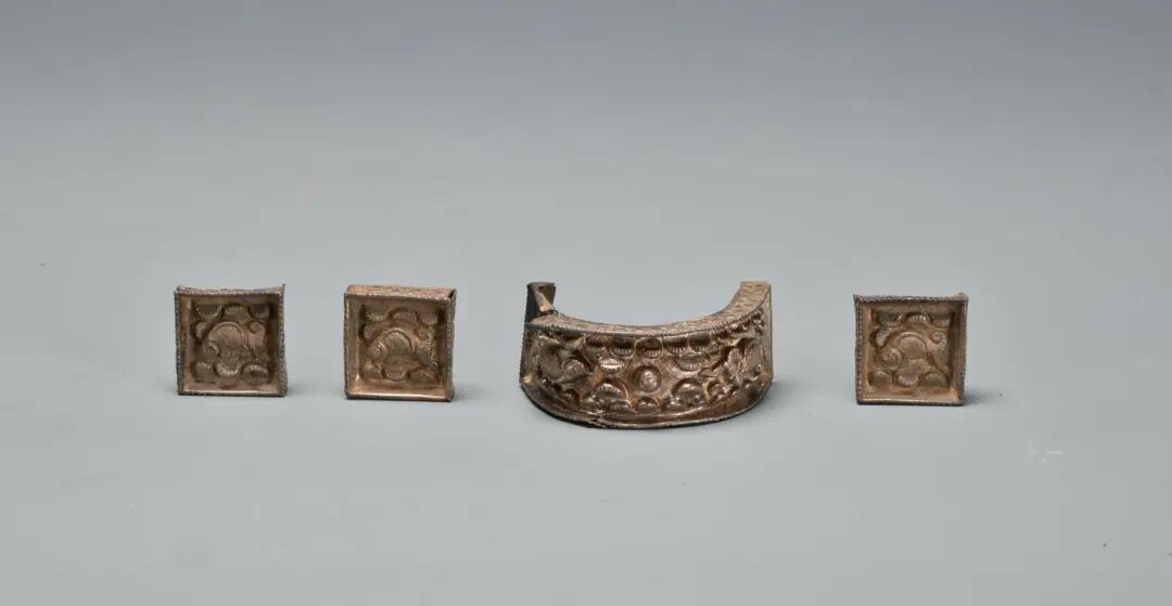 这组银鱼袋、银带銙(kuǎ),有折沿,背面有扣钉,为革制皮带上的饰件。四件折沿外侧均阴刻波涛纹,其中三件为方形带銙,主体纹饰为高凸花波涛,拱卫中央一尾鲤鱼。一件为单拱形鱼袋,饰高凸花饰海水双鱼,原应有一对竖向拱形饰。