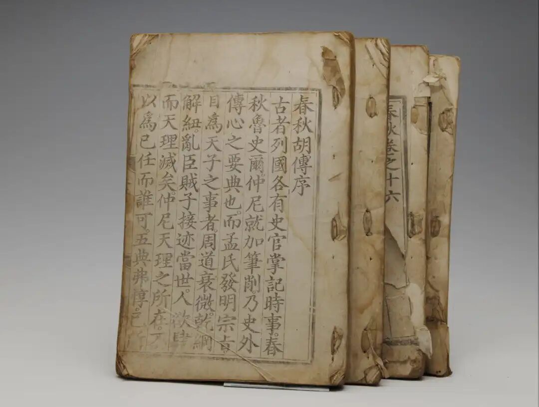 杭州博物馆藏《春秋胡传》为正统十二年(1447),明英宗敕命司礼监刊刻《五经》中的一部。半叶八行,行十八字,小字同,黑口,四周双边,双黑鱼尾。明代内府刻本就是明代皇家的刻书,属古籍版本领域非常重要的版本类型之一。