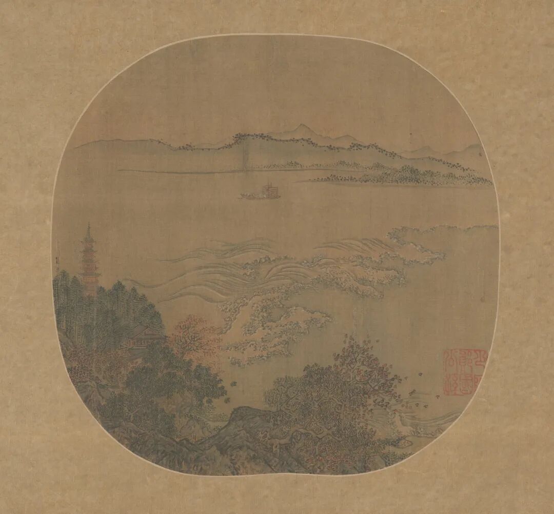 此图采用“之”字形构图,实左虚右,以怒潮一线斜出而沟通前后,避免了院体通常置景前后孤立之弊。近岸山峦林木蓊郁,现楼阁一角,又有六和塔矗立其中,描绘简略但不随意。中景江面潮水翻腾,波澜壮阔,接天巨浪翻涌而来,有排山倒海之势,江面有游船往来。远岸群山连绵,时隐时现,连勾带染而成,更添画面辽阔之感。画面尺幅虽小,却能小中见大,展现钱塘潮的汹涌壮观。左方树梢款署二字,因绢本破损,仅余一“夏”字依稀可辨。