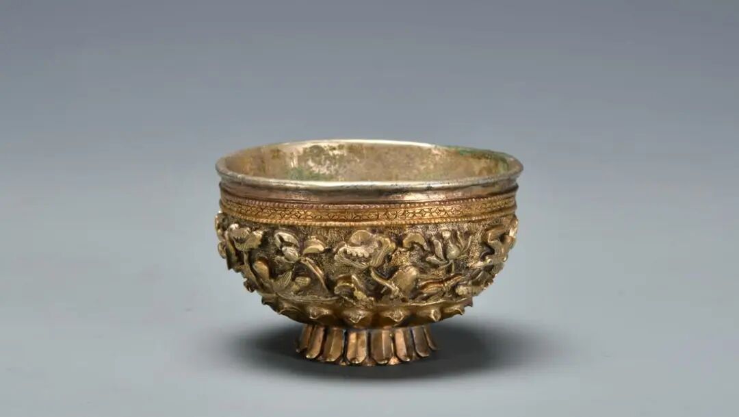 鎏金银盏。圆形,弧腹,圈足外撇。由内外两层组合而成,内壁外卷,翻扣口沿;外壁满饰花纹,上为两道连珠纹包夹花卉纹,中为高浮雕荷塘小景,称“满池娇”,下为莲瓣纹,圈足环绕覆莲纹,内有“溪”字款。