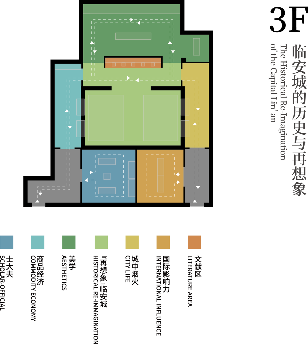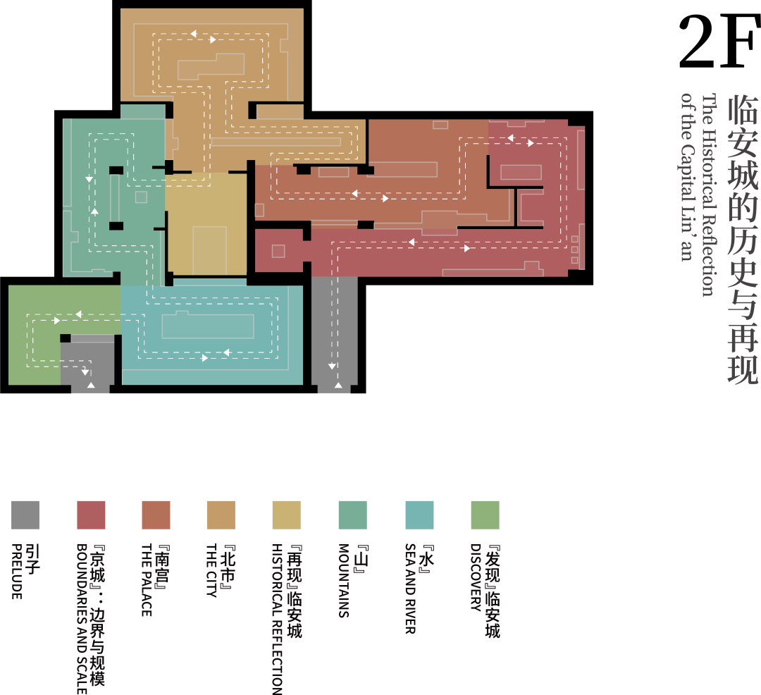 展厅二楼从城墙开始,展示皇城到礼制建筑与中央官署、御街到官署住宅及公共设施的考古发现,辅以历史文献与现代诠释,展现临安城的城市布局与功能,以山、湖、河、海为脉络,展示临安城作为典型南方山水城市的特点,“再现”南宋视野下与杭州城相关的历史。
