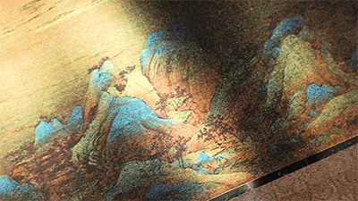 《千里江山图》(宽10cm 长290cm),得到乾隆帝特别题诗“江山千里望无垠”!而且是由宋徽宗亲自指点完成!