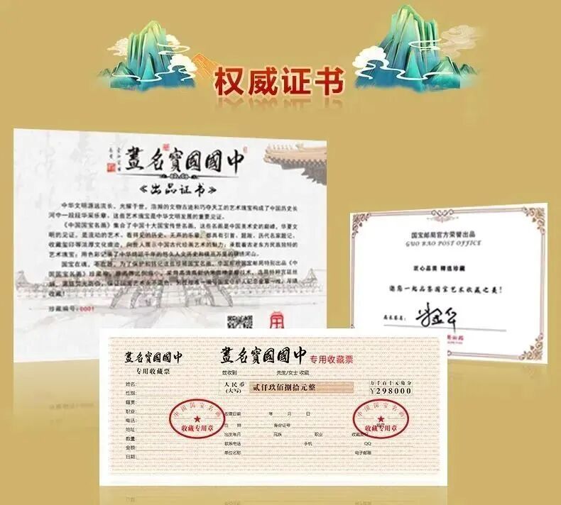 每套都有收藏编号、出品证书、防伪证书、收藏票据和国宝邮局局长签名卡,一应俱全,确保其质量与价值。