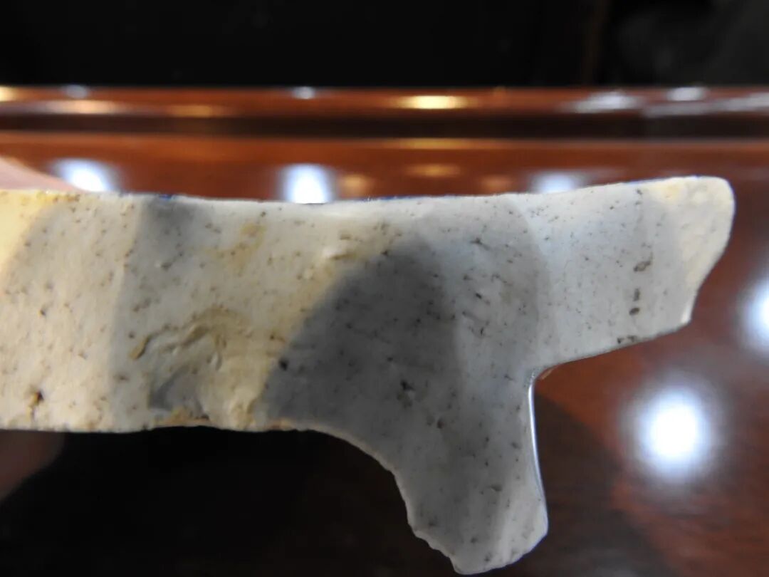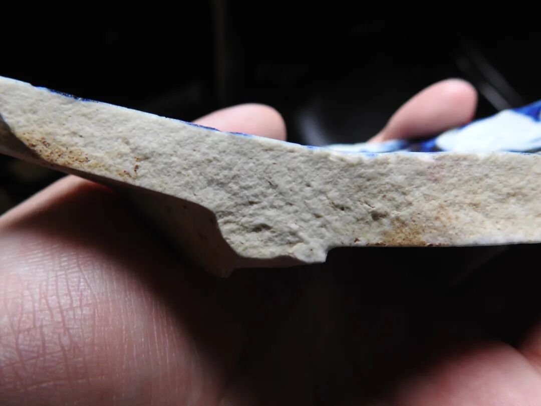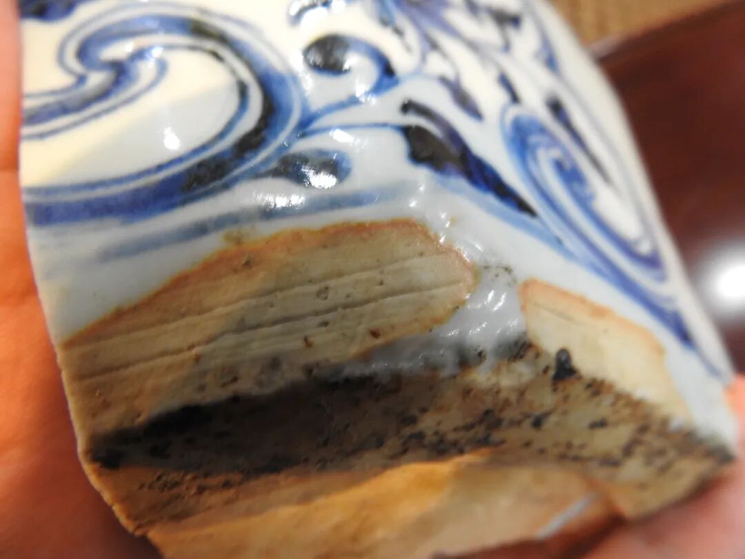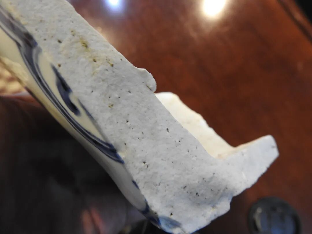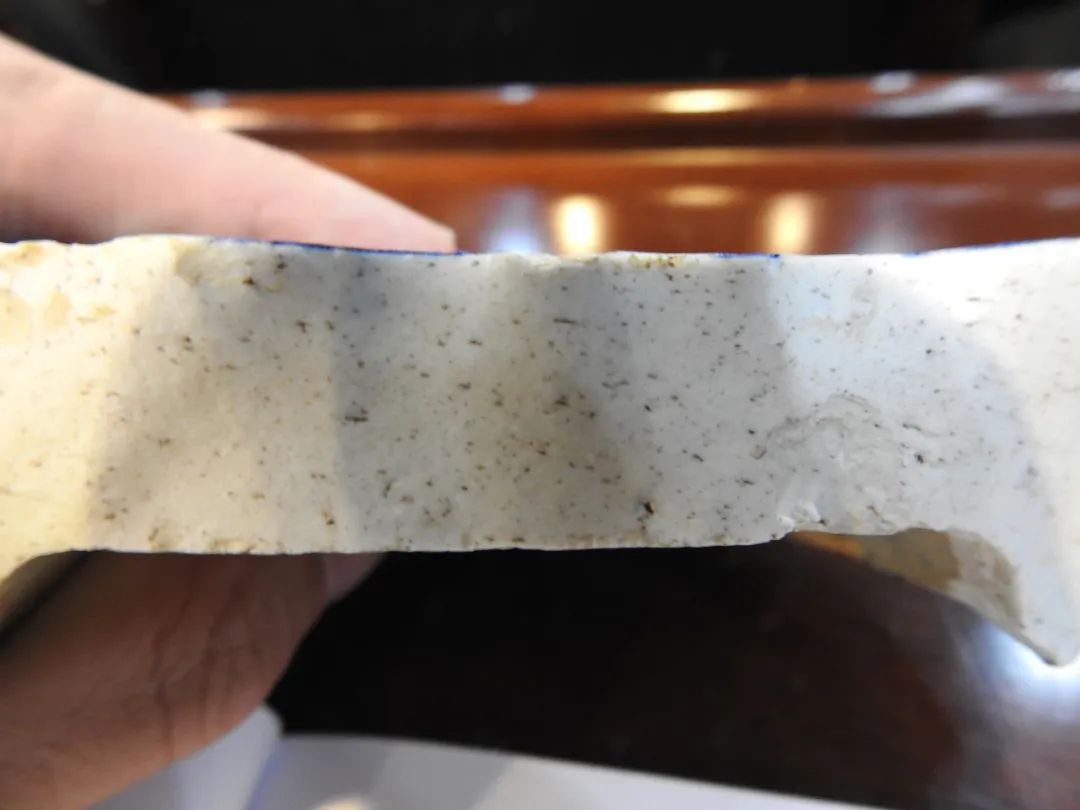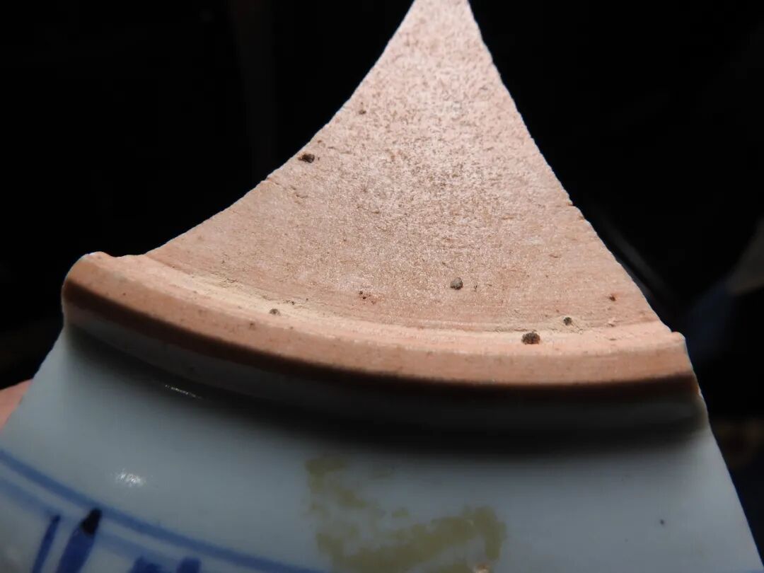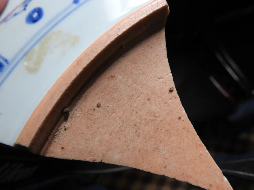麻仓土的第一特征是有“糖点”。何为糖点?上等土烧制的瓷器洁白如玉。麻仓土由于需要粉粹,器物底有颗粒感,而高岭土为粉末状,颗粒感较弱。元代和明代烧制瓷器的胎土配方是麻仓土加上瓷石的二元混合胎质,其烧制成功后的颜色是一种白胎中微带淡黄色的呈色。其中火石红明显。清代瓷器的胎土配方是高岭土加上瓷石的二元混合胎质,其烧制成功后的颜色是一种纯粹的高白色。。明代、清代这两种胎质烧成后的呈色的不同,也是明清两朝瓷器断代的重要依据之一。
