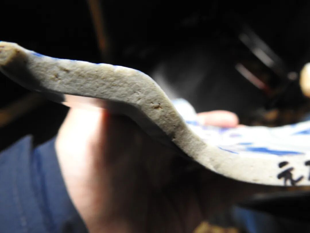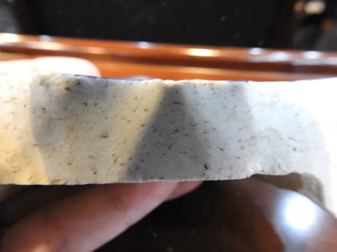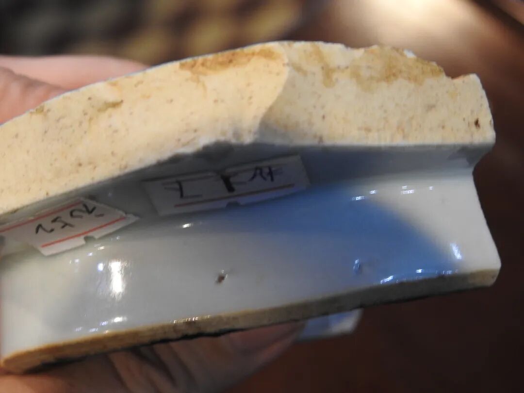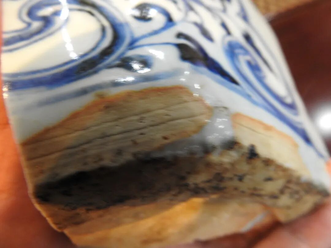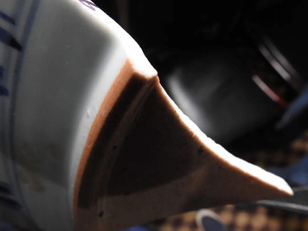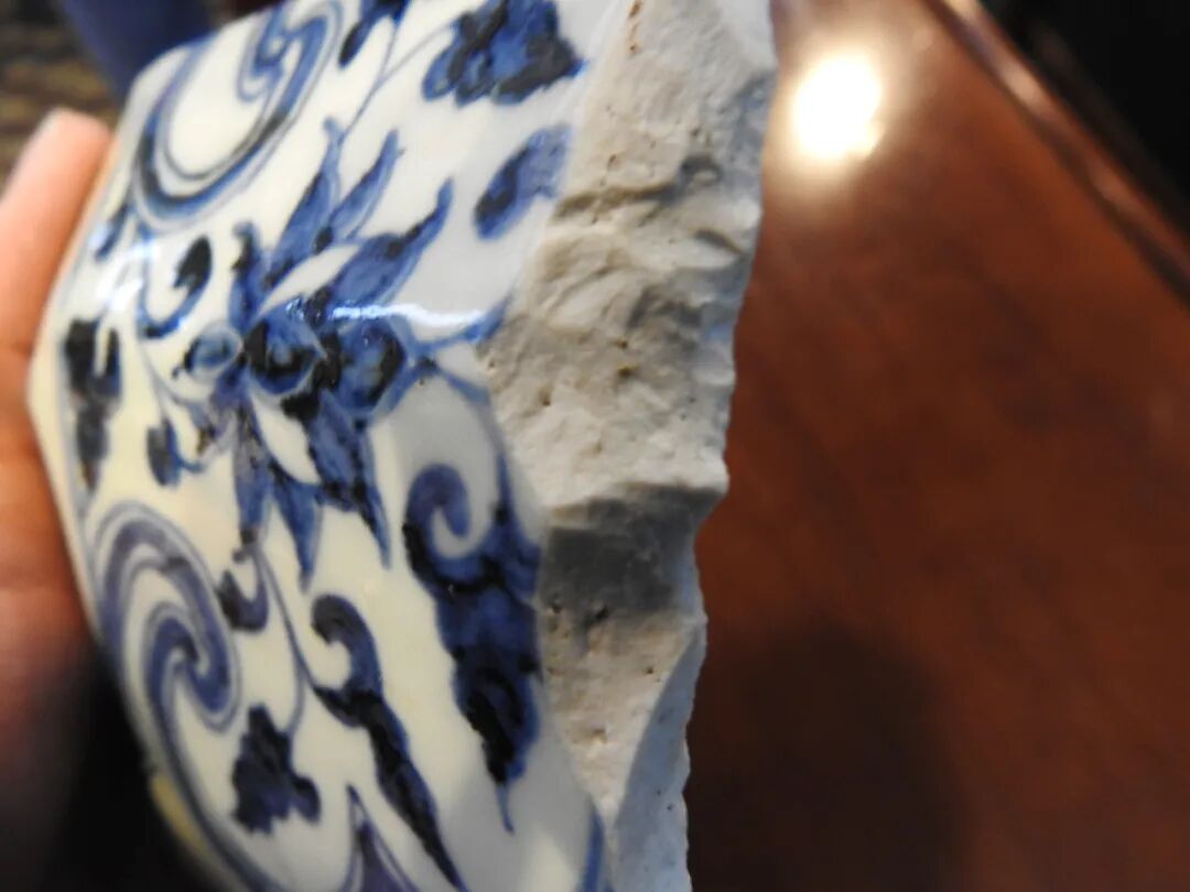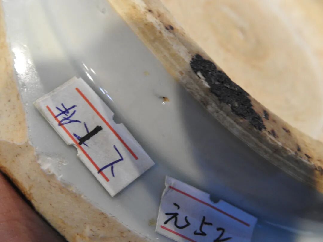 麻仓土的第一特征是有“糖点”。何为糖点?上等土烧制的瓷器洁白如玉。麻仓土由于需要粉粹,器物底有颗粒感,而高岭土为粉末状,颗粒感较弱。元代和明代烧制瓷器的胎土配方是麻仓土加上瓷石的二元混合胎质,其烧制成功后的颜色是一种白胎中微带淡黄色的呈色。其中火石红明显。清代瓷器的胎土配方是高岭土加上瓷石的二元混合胎质,其烧制成功后的颜色是一种纯粹的高白色。。明代、清代这两种胎质烧成后的呈色的不同,也是明清两朝瓷器断代的重要依据之一。