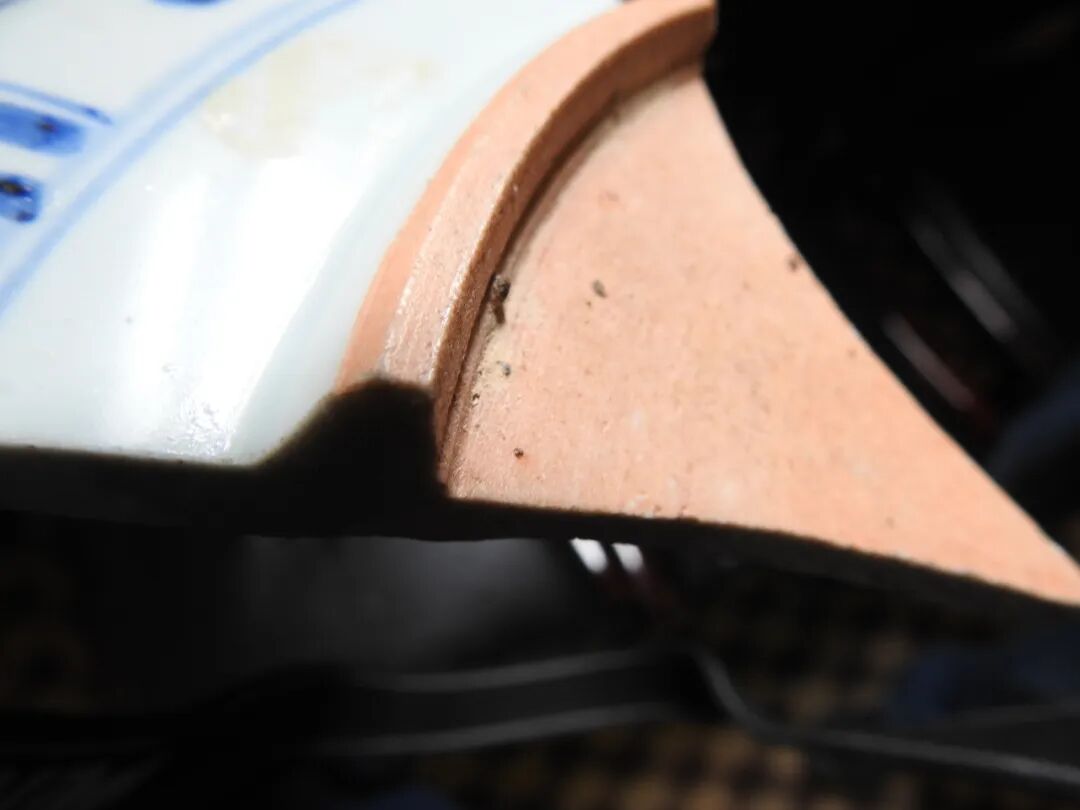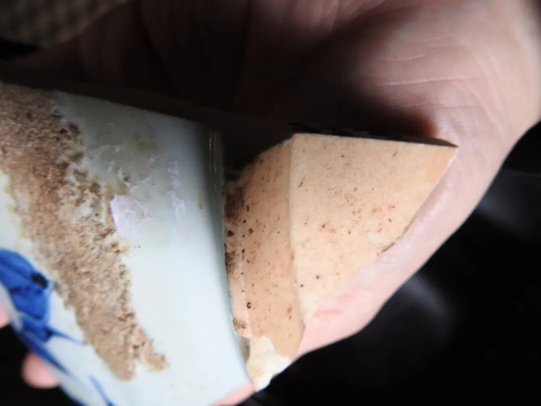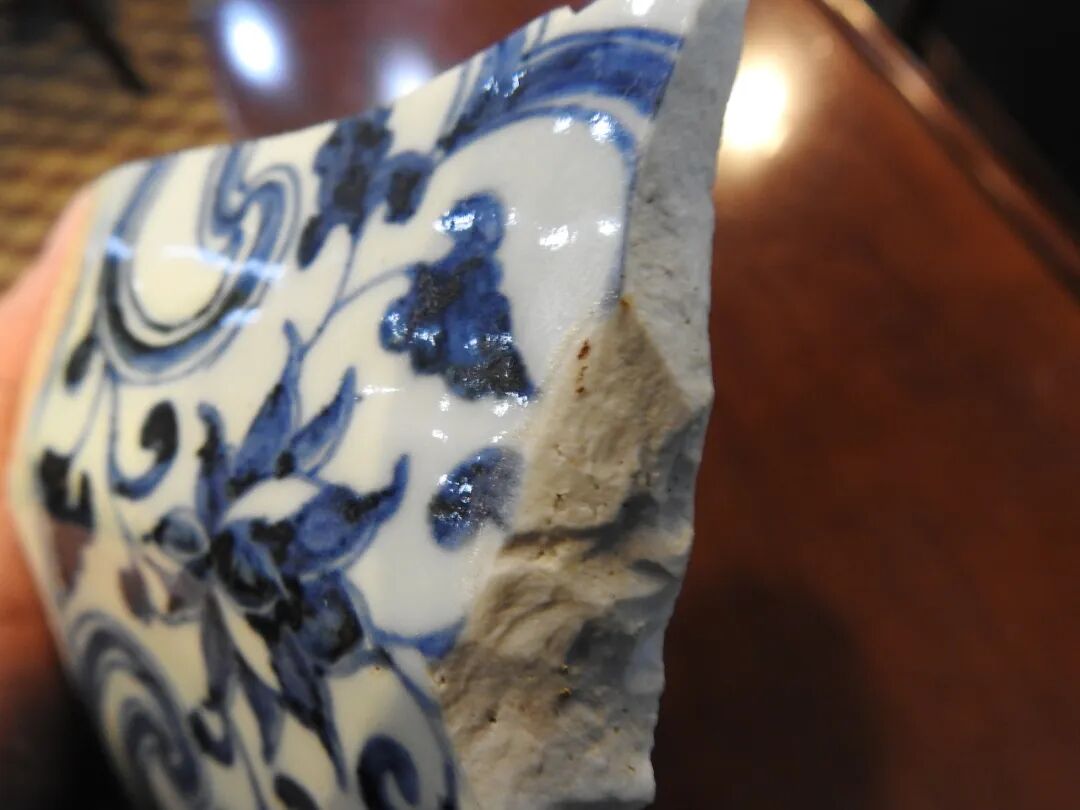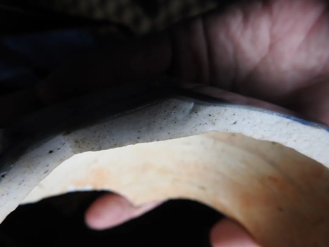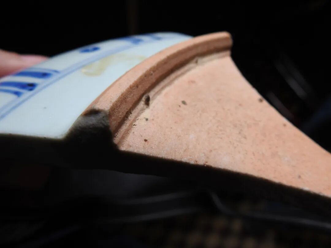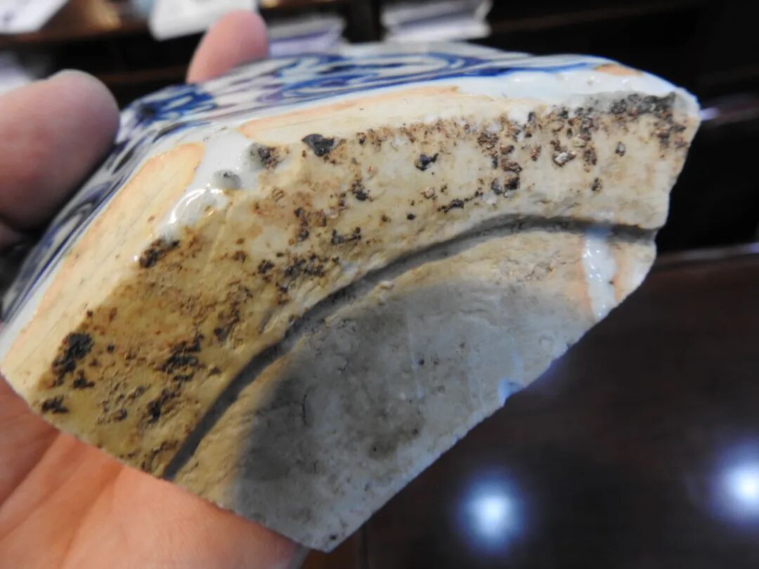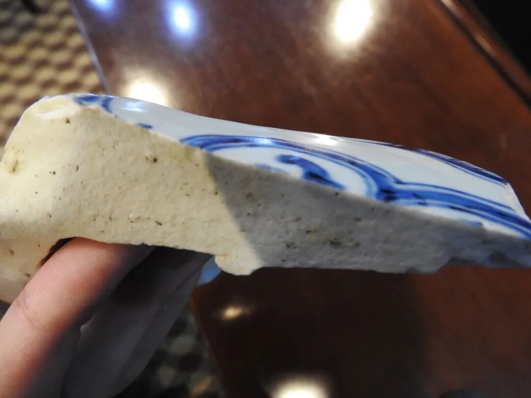 麻仓土的第一特征是有“糖点”。何为糖点?上等土烧制的瓷器洁白如玉。麻仓土由于需要粉粹,器物底有颗粒感,而高岭土为粉末状,颗粒感较弱。元代和明代烧制瓷器的胎土配方是麻仓土加上瓷石的二元混合胎质,其烧制成功后的颜色是一种白胎中微带淡黄色的呈色。其中火石红明显。清代瓷器的胎土配方是高岭土加上瓷石的二元混合胎质,其烧制成功后的颜色是一种纯粹的高白色。。明代、清代这两种胎质烧成后的呈色的不同,也是明清两朝瓷器断代的重要依据之一。