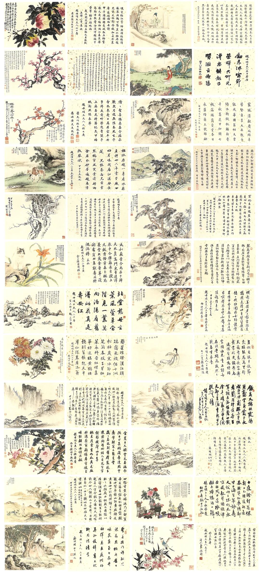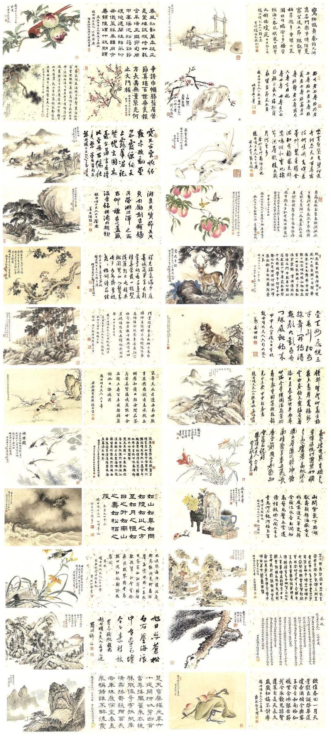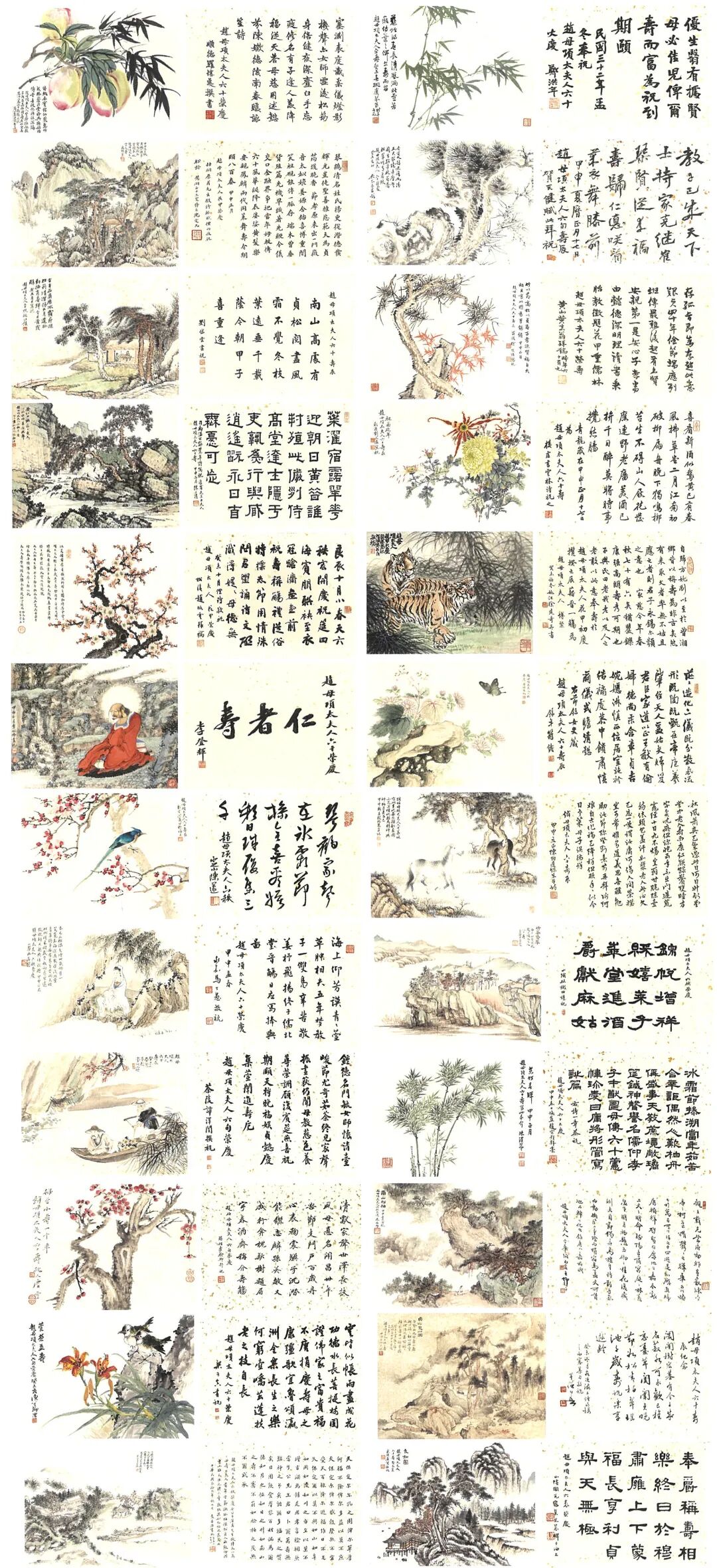 花木、鸟兽类作品颇多,佳制亦夥最可称道者,如:汤涤画墨松(第十三开),通天入地,左伸右突,画虽小而颇具张力;刘海粟之松(第七十一开)充分发挥生宣之质,笔法苍润兼列;齐白石之多寿(画第十五开),三桃形甚整,颇大气于非厂之朱竹带(第二十五开),造型简而笔法精,色彩对比更增喜气;书法家白蕉画亦甚精,其兰馨芝寿图(第一一三开),枯笔写灵芝,湿笔赭墨画兰草,雅甚。书画通,诗书画三绝,诗书画印四全,画中有文思,题识有文采,亦为中国艺术综合性特征时下之人于此远不及前代