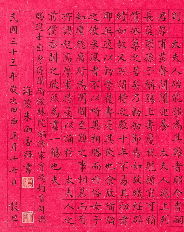 仔细阅读该册,又将会发现征集作品时出现了特例。如郑师玄绘项夫人肖像(册页第十一开)署“愚侄商泽如拜祝,慕康郑师玄敬绘”陶冷月绘松风清溪(册页第三十九开)款识注明“其姻侄杨声煜君属写此图,以作九如之颂”;叶先圻书贺词(册页第六十二开)署“叶先圻撰句敬书,愚侄黄光度敬祝”:童大年绘红梅(册页第六十三开)亦写明“愚侄黄光度恭祝”;贾森绘富贵长春图(册页第九七开)下款为“侄韩纯清率男绍魁全拜贺,癸未一阳月筱亭贾森摹古,竹庵居士题记”,此类作品当然并非赵厚甫直接征集,乃亲属出资求书画加入此册者。