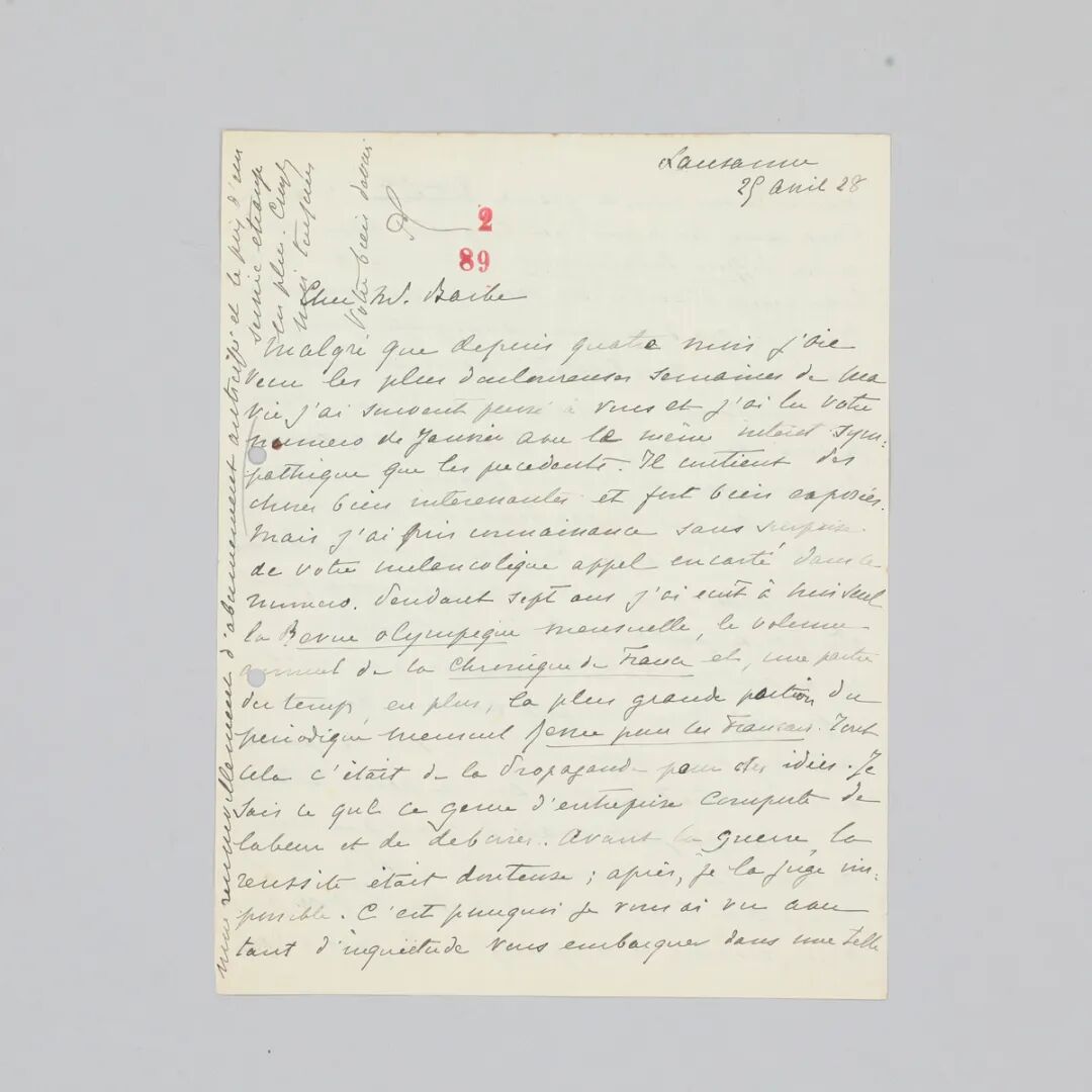 此为“奥林匹克之父”顾拜旦1928年4月25日所作信札,围绕回忆编辑《奥林匹克评论》(Revue Olympique)与《法国编年史》(Chronique de France)以及第一次世界大战往事而作。 信札通篇亲笔,二页,法语,作于奥委会所在地,亦是作者后来的安息地瑞士洛桑。信笺首页左上角署有本款“P.C.”。顾拜旦已于1925年荣休并卸任国际奥委会委员和主席,仅保留荣誉主席身份。此信中,顾拜旦先讲道“尽管过去的这四个月可以说是我此生中最痛苦的一段时间,但我仍时不时想到您的事情,还拜读了您《教学综合》的一月刊…”,后又回忆自己担任编辑以及一战时期的往事“在整整七年的时间里,我亲自编撰了《奥林匹克评论》月刊和《法国编年史》…战前我对成功的几率已然存疑,但在战后便是绝无可能了…我若还财力富足的话,其实是十分愿意在金钱上支持您的出版事业的。唉!可惜啊,我和许多人一样被战争消磨的一文不剩……”。可见当时巴贝先前致信顾拜旦,希望在经济上得到后者的资助。信中所及的七年时间应指1900年至1906年的这段时间,在这段时间内顾拜旦夜以继日编纂《法国编年史》。《奥林匹克评论》月刊在一战前陷入困境,战后不得不停刊。上款简介:赫克托·巴贝[Hector Barbe,近现代],法国教育家、编辑,狂热的赫伯特主义(社会达尔文主义)者,编辑有颇受欢迎的教育杂志《教学综合》(La Synthèse Pédagogique)。