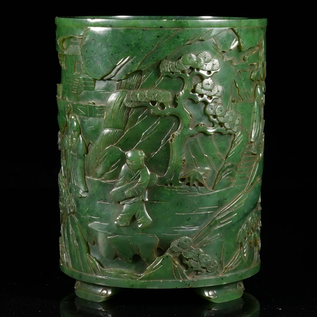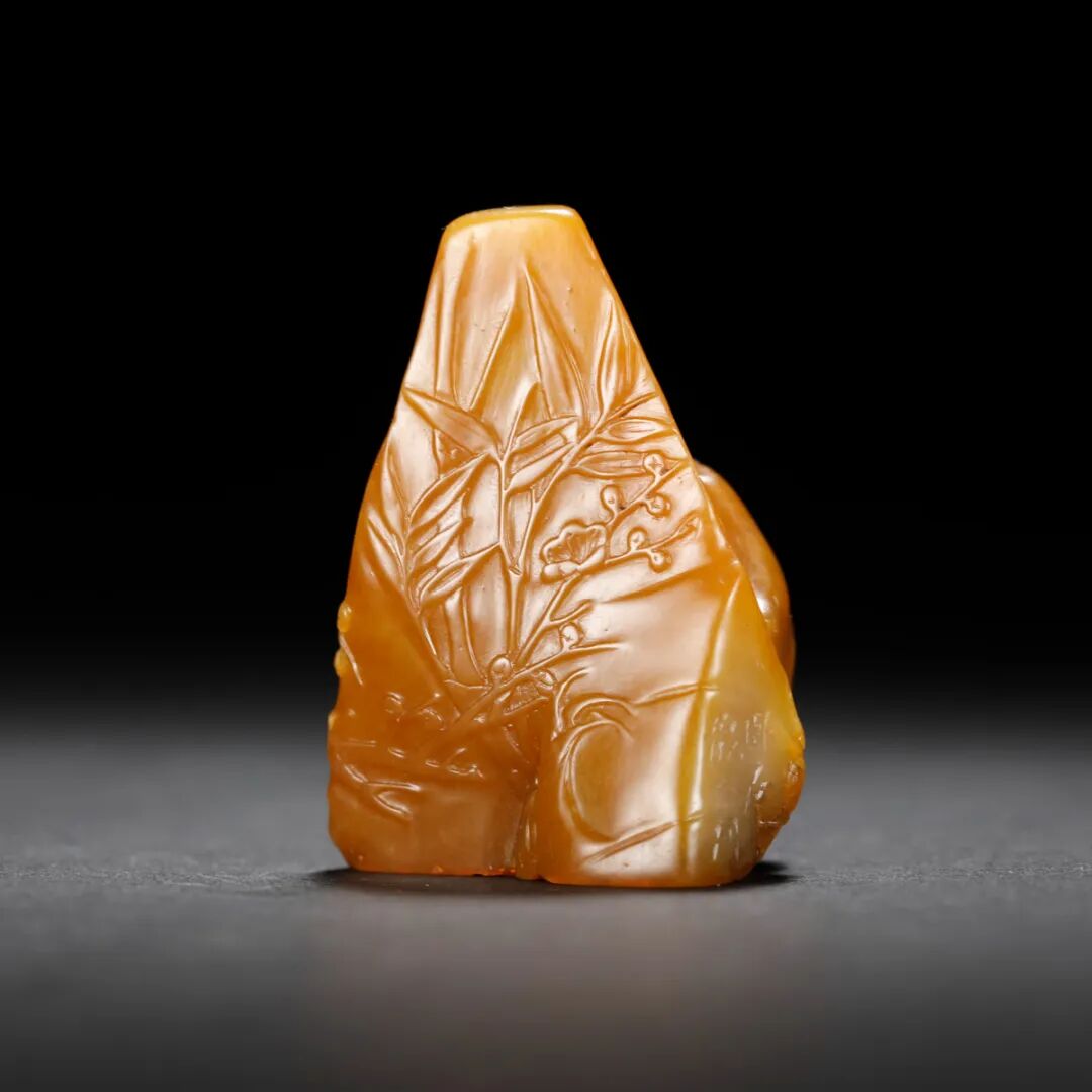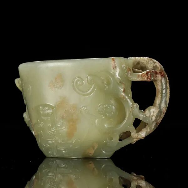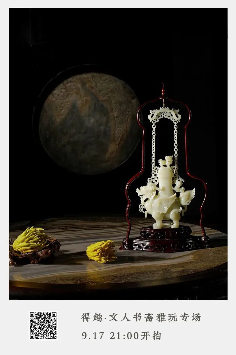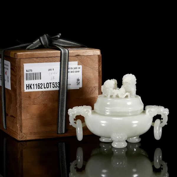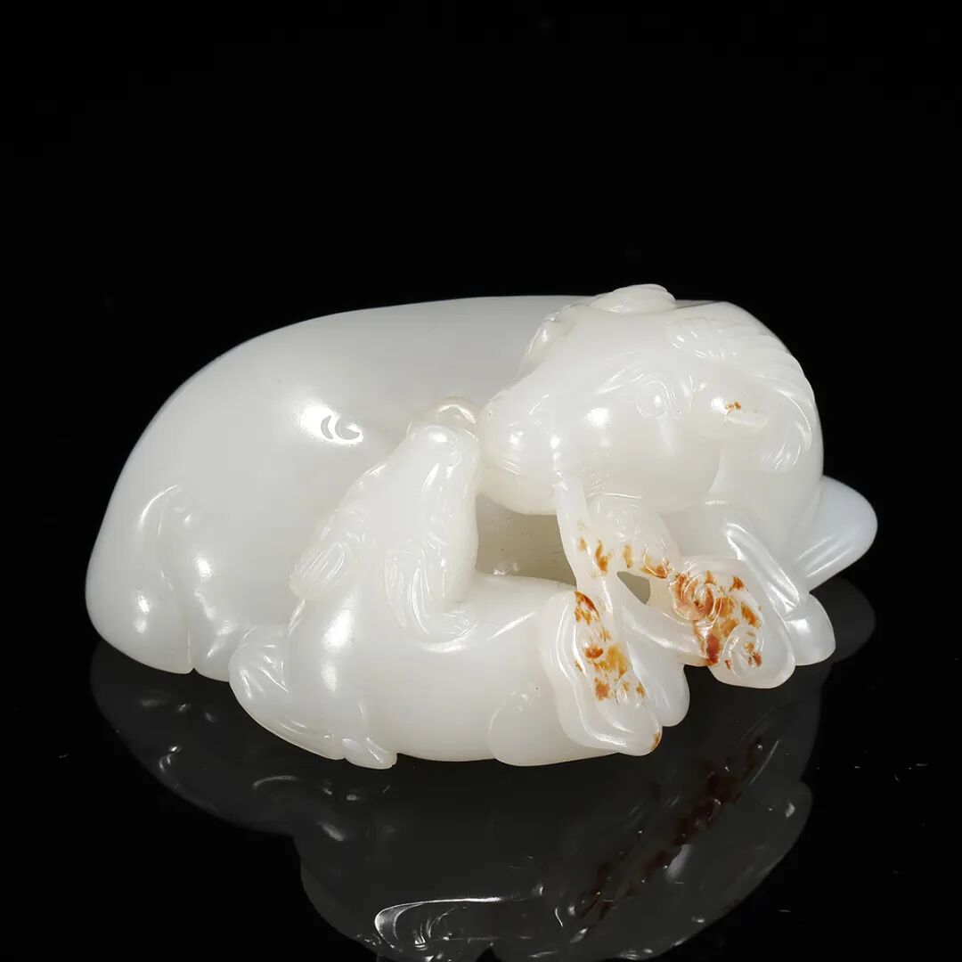 YOUNGMAN)旧藏。2.邦瀚斯纽约。说明:此器由白玉圆雕而成,玉质若羊脂,白润细腻,油脂感十足,局部带红皮。一大一小两只羊,大羊呈跪伏状,身形丰硕饱满,圆眼,卷角,神情纯净温良,扭首回望,嘴衔灵芝一束。身前小羊附耳温驯,紧紧依偎于侧。小羊抬头仰望大羊,双羊面部相贴,更显舔犊情深。羊作为中华先民最早驯化的大型家畜之一,在中华文化之中有着深厚的积淀,汉字“美”就是因借羊而创造,所谓“大羊为美”。以双羊作器,借谐音寓意“洋洋得意”。古时“羊”与“祥”通,所谓“羊”,祥也,由此取吉祥之意。吉祥也多写作“吉羊”,汉瓦当中亦有“大吉羊”的字样。羊亦通“阳”,取其冬去春来,阴消阳长,有吉亨之象,多用于岁首祝颂之辞。此双羊圆雕玉质与工艺均为一流,充分显示了清代玉器的精巧构思与精湛工艺,既可作为文房陈设,亦可作把件或镇纸使用。 藏家简介:罗伯特.杨门(Robert P. Youngman),曾任米德尔伯里董事会主席(Middlebury Board of Trustees 1993-1995),在董事会任职15年。他在金融界享有很长的职业生涯,并在母校建立了捐赠资金,以支持亚洲艺术的收购和管理。在长期患病后,于2018年1月1日77岁在纽约去世。在获得政治学学士学位后,Youngman在菲律宾马尼拉的美国国际再保险公司开始了他的金融职业生涯。1977年,他创立了投资管理公司Granite State Corporation,后来被称为Hovey,Youngman Associates,最后成为Griffin Asset Management。年轻人对亚洲艺术和文化的浓厚兴趣使他和他的妻子芭芭拉在米德尔伯里学院建立了大量的捐赠基金,以支持艺术的收购,艺术品的展览和编目,亚洲地区的学生实习艺术,以及艺术作品的准备和策划。他对艺术充满热情,其家族捐赠了许多收藏品给艺术博物馆。
