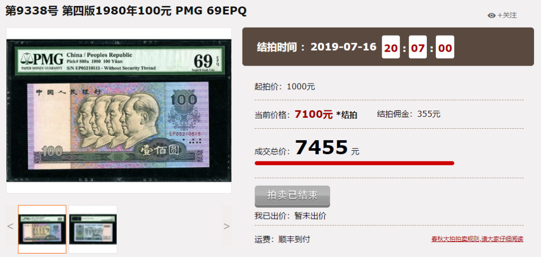 就是这样一张100元纸币,曾在19年的一场网拍上以7455元的高价成交!这张纸币是在2018年正式退市的,在短短一年内就有如此表现,实力不容小觑啊!