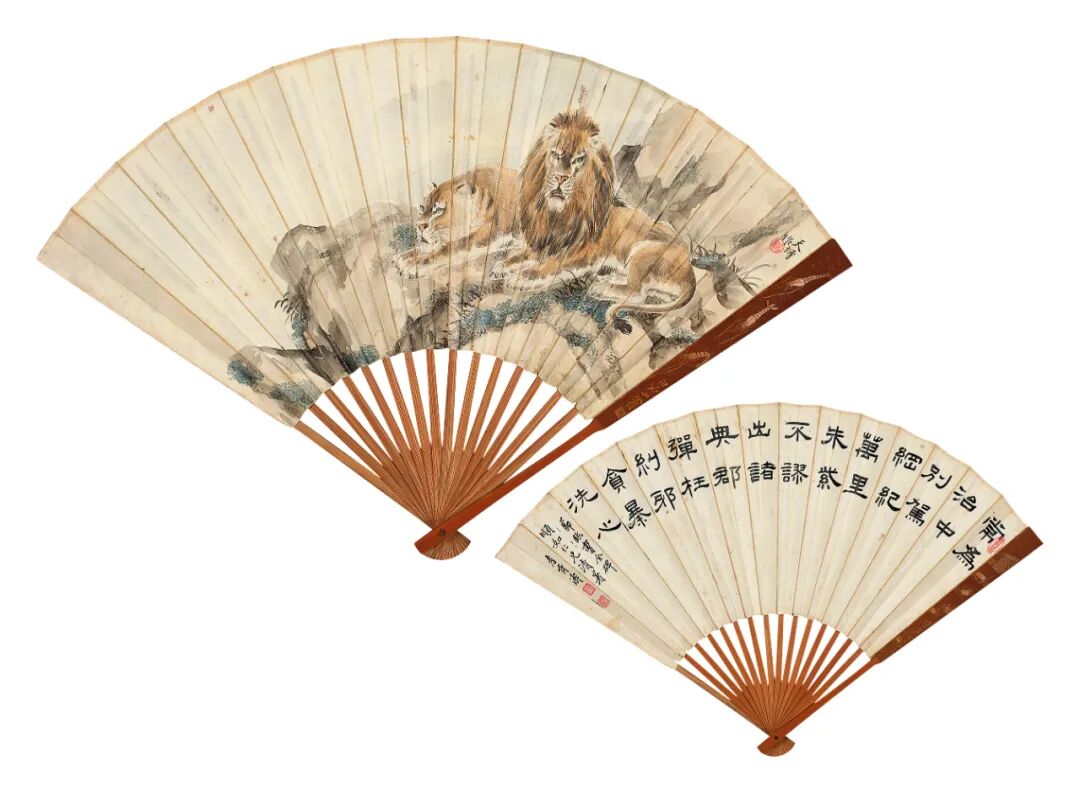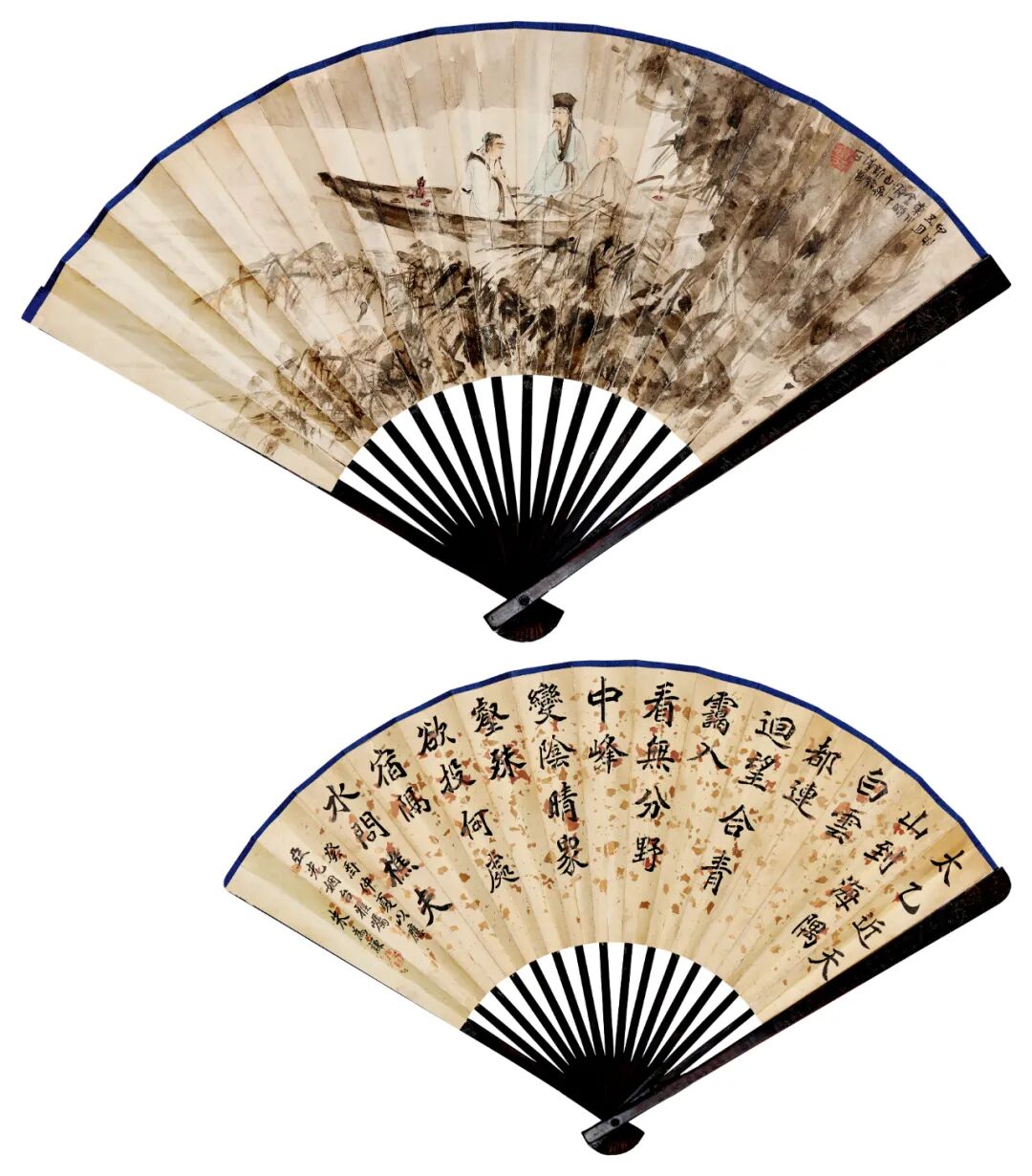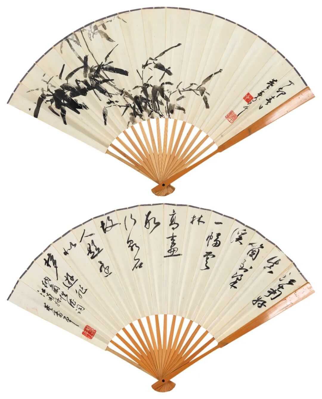 曾出任山东博物馆绘画组长的吴天墀(1892-1974)擅画走兽,尤精狮虎,刻写神态生动逼真;与他同为山东人大代表的黄孝胥则是客居青岛的古琴学家兼书法家。吴黄二人合作赠顺如先生之扇,合二人之长,又得齐白石刻扇骨,极为罕见。又董寿平赠王墨臣之《墨竹·草书诗》扇,以浓淡墨绘墨竹数竿,竹叶于风中翻飞起舞,饶见风致。