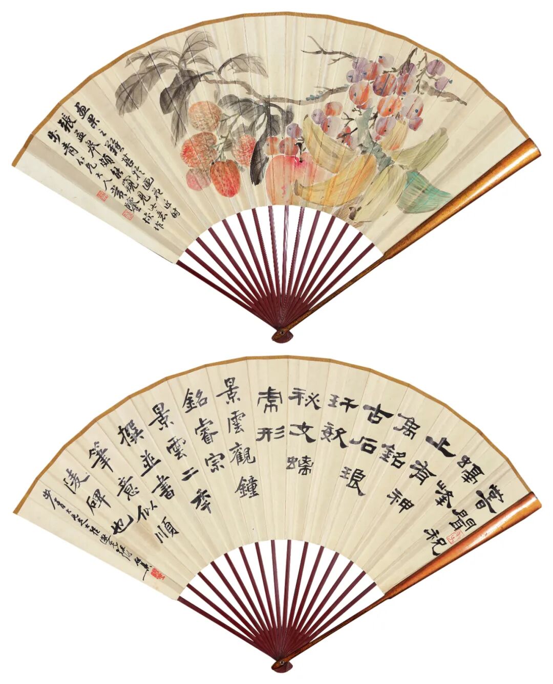 吴江陆恢(1851-1920)曾先后客吴大澂、张之洞幕,又号为“画中九友”之首,笔墨当然不可等闲视之。他与张祖翼合制赠平步青之《平安大礼·隶书五言诗》扇,由陆氏写苹果、荔枝、香蕉等数种果品,经营巧妙,敷色鲜妍,又不似后来海派中人笔下流于俗气。同客海上的汪琨(1877-1946)原系江西婺源人,早年曾参加豫园书画善会,后并一度任会长。仲山好摹古,尤精于拟四王山水,几可乱真。此件赠松藩先生之《松溪策杖》仿王蒙法,绘松溪人家,一人正行至小桥上,望声而拜,意趣高雅,笔墨亦极工致流丽。