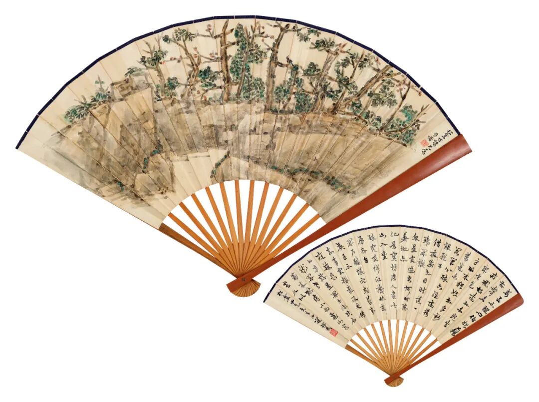 本期成扇之什,虽未成专题,但细细翻检,决能寻出娱情悦性者,如庞虚斋、方药雨、董寿平诸人所制。庞虚斋(1864-1949)以收藏名天下,所藏宋元名迹不知凡几,是以眼界极高,而出手自亦不凡。为海上名家樊浩霖制《小园新篁》以恽南田法写出,绘后园拳石,旁出墨竹一枝,下则有新篁竞出,别饶雅趣。同以收藏闻名的方药雨(1869-1954)曾为“天津报案”主角原系浙江镇海人,后居天津,其古泉之藏与海上张叔驯、重庆罗伯昭并列,时有“南张北方西蜀罗”誉。方氏闻见和格调亦不俗,与南海罗复堪合制《松林风静·行书诗》扇即可鉴之。其所绘山壑迂回,上有青松若干,布置、经营、结构均颇具现代意味。