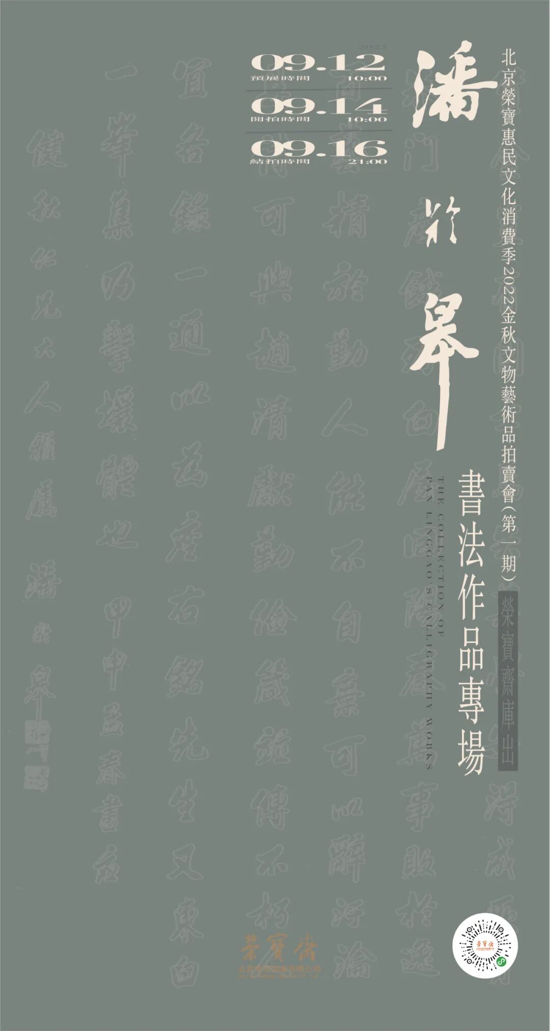 北京荣宝惠民文化消费季2022金秋文物艺术品拍卖会(第一期)——荣宝斋库出·潘龄皋书法作品专场将于9月12日10:00—9月14日10:00开启线上预展,并于9月14日10:00开拍,9月16日21:00结拍。