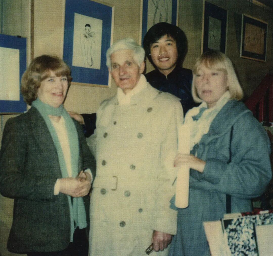 1984年3月,法国作家米谢.阿拔赫(前中)、台湾艺术史学者陈炎峰(第二排)与友人摄于常玉的巴黎个展中
