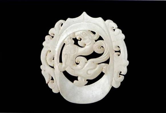 长6、宽4.5、厚0.4厘米,现藏陕西历史博物馆。1952年西安西郊汉长安城西侧皂河出土。以新疆和阗白玉雕琢,洁白无瑕,温润莹秀,整体为椭圆形片状,正面中部圆孔中镂空透雕一条腾空驾雾的游龙,龙首呈虎头形,龙张口,下颚及颏部呈斧形,双耳上耸,挺胸,四肢或伸或蹬,龙头顶琢出一回卷长发,尾部琢扭丝纹上翘回卷。佩上端为尖状凸起,佩两侧透雕出变体凤鸟纹,并不完全对称,略有差异。此韘形佩玉质上乘,构思巧妙,工艺精湛,纹饰流畅,属汉代玉鞣中的精品。