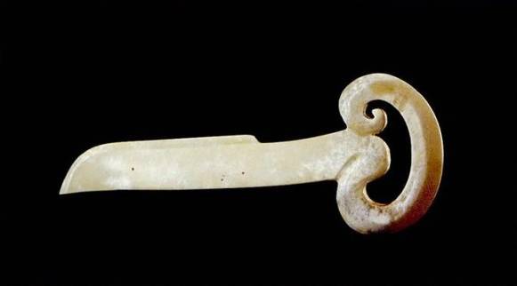 长7.8厘米,现藏陕西省考古研究院。2005年西安市北郊井上村新莽时墓葬出土。青玉,玉色鲜润,玉质细腻,玉刀身直背厚,前端呈弧形,两面开刃,环首大致呈椭圆形,靠刃一侧并回钩,两面中部均起脊线,沿脊线向两面抹斜,抛磨光洁,工艺考究,无任何使用痕迹,应是有礼仪性的器具,此刀是汉代玉器中罕见的精品。