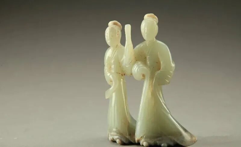 现藏西安博物院。2010年8月25日杜陵陵庙遗址出土。为一对相连的立体圆雕玉舞人,造型、大小相同,系一块玉料雕琢而成。玉舞人并排而立,重250克,玉材上下两端均为浅褐色,玉工巧妙利用这些特点将其作为玉舞人的头发和衣摆及脚部。主要采用立体圆雕技法之外,还采用了镂空透雕和细线阴刻技法,玉工精准地捕捉并生动表现了舞女跳舞时的瞬间姿态,它是迄今为止发现的有明确出土记录的形体最大的圆雕玉舞人,风姿绰约飘逸,面部表情怡然恬静,形神兼备,栩栩如生,衣褶自然起伏,线条优美流畅。
