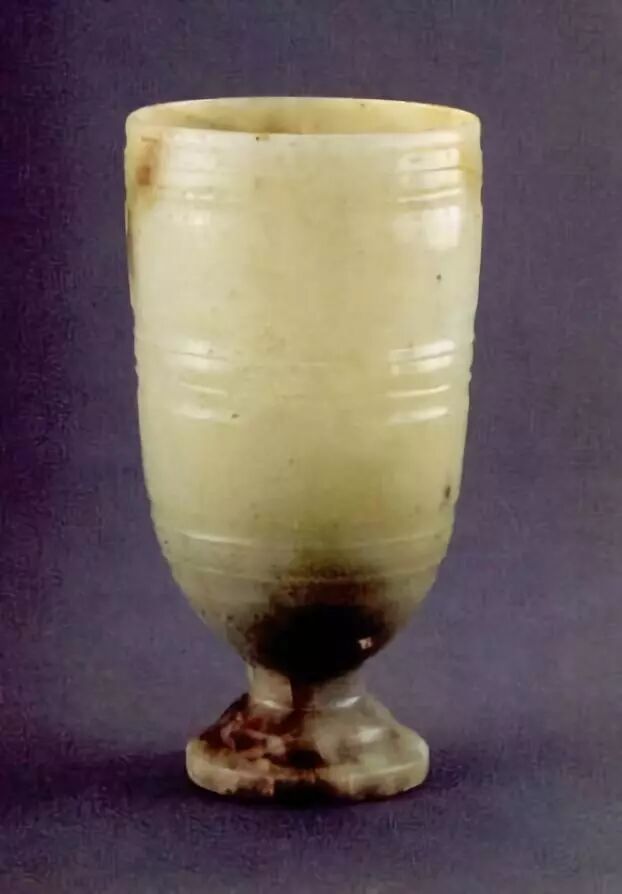 原来三件玉杯极有可能均束有四只金箍,玉杯腹部最薄处的厚度仅为0.1厘米,由于玉杯内底呈半球状,在掏膛取芯之后,仍需用圆球状膛铊反复琢磨,并对底部进行抛光,其工艺难度极高,杯体外碾琢的凹旋纹均匀流畅,既可使金箍紧贴杯体,又可增加手持时的摩擦力,并且还具有较强的装饰性。